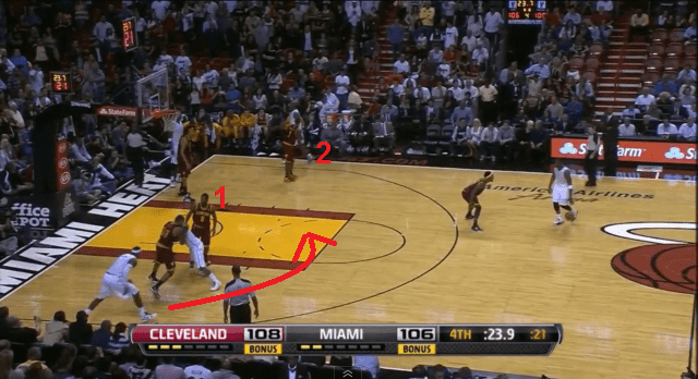 > Mario Chalmers étant largement plus petit et léger qu’Alonzo Gee, le meneur du Heat pousse de toutes ses forces sur son écran pour permettre à Lebron de réaliser ce qu’on appelle un « curl » parfait, c’est à dire couper dans la raquette en courbe, comme la flèche l’indique, afin d’obtenir la balle le plus proche possible du panier, et attirer plus de défenseurs. Remarquez à quel point ce système espace la défense : personne dans la raquette des Cavaliers, un énorme boulevard pour Lebron. Deux erreurs ont déjà lieu du côté de Cleveland. Premièrement, Jeremy Pargo (1) est censé se présenter devant James, pour rendre son curl le plus large possible, et permettre à Gee de le récupérer le plus loin possible du panier. En restant attaché à Mario Chalmers, il n’aide pas son coéquipier qui va devoir non seulement défendre sur le MVP en titre proche du panier, mais en plus se prendre un sale écran mal aidé. Deuxièmement, Dion Waiters (2) tourne le dos à l’action. Le joueur sur lequel il défend est certes dangereux, mais son regard devrait être périphérique, à moitié sur Ray Allen, à moitié sur le côté de la balle, afin de venir en aide si besoin est. Lebron va maintenant se lancer.
