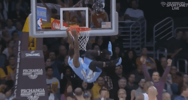 Quelle que soit l’équipe dans laquelle il joue, Nate Robinson arrive toujours à attirer l’attention sur lui. Quand ce ne sont pas ses crossovers bien saignants, ce sont ces tirs ultra-clutchs en fin de match. Quand ce n’est pas en faisant une vidéo hilarante sur Youtube, il sort des cartons offensifs dans tous les registres. Mais si Little Nate restera gravé dans l’histoire de la NBA pour une chose, c’est bien sa capacité à dunker sur tout, n’importe qui, n’importe quoi, et dans des situations inattendues. Plutôt collé au sol depuis son arrivée à Denver cet été, la puce a décidé de sortir sa cape hier à Los Angeles : on en redemande, grand fou va.
