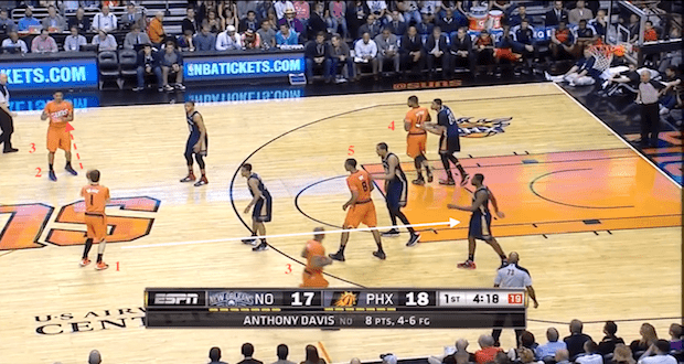 Le 5 est composé de Goran Dragic ( 1 ) , Gerald Green ( 2 ) , P.J. Tucker ( 3 ) , Markieff Morris ( 4 ) et de Channing Frye ( 5 ). Du coté de New-Orleans, on retrouve Brian Roberts, Eric Gordon, Tyreke Evans, Anthony Davis et Alexis Ajinca. Goran Dragic confie le soin de gérer la gonfle à Gerald Green. Après cela, il va descendre près du panier pour aller chercher le contact, ce qui lui servira à créer un léger espace qui lui sera très utile à la fin de ce système. Markieff Morris à l’opposé va quant à lui remonter pour libérer de l’espace près du panier ( zone hachurée ) en se positionnant derrière la ligne à trois points, pour éventuellement offrir une première possibilité de tir suivant la réaction de la défense.