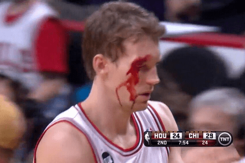 Sur le passage en force, l’ailier de Houston donne involontairement un coup de coude au visage du joueur des Bulls. Conclusion, arcade ouverte. Pas un souci pour Mike Dunleavy Jr qui, très lucide, se relève et repart en trottinant vers son banc pour se faire soigner. Il rentre alors aux vestiaires afin de se faire recoudre par le staff médical, et les commentateurs annoncent même que le match est sûrement fini pour lui.