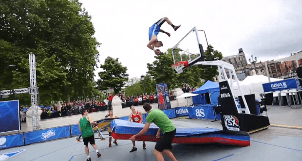 C’est Botond Dajka de la troupe Lords of Gravity qui s’est illustré récemment avec un dunk venu de nulle part. Son idée : utiliser le plexiglas comme un mur pour y réaliser un salto. On se dit donc en avance que ça va être un massacre et que l’intéressé va finir les molaires sur le bitume avant d’aller à l’hôpital, mais à Bilbao lors de l’évènement NBA 3X Streetball le garçon a réussi son pari. On n’a pas besoin d’en dire plus, c’est juste hallucinant !