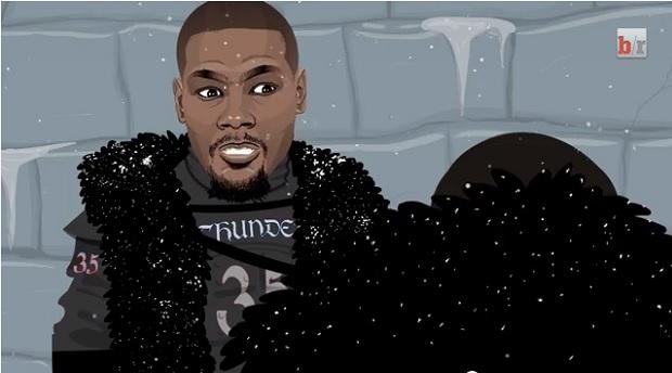 Ceux qui connaissent (qui ne connaît pas ???) la série Game of Thrones vont clairement se taper des barres en découvrant Game of Zones, la parodie façon NBA de la « success serie » de HBO, à travers ce véritable petit bijou d’animation. Kevin Love, Stephen Curry, Russell Westbrook, LeBron James, Kevin Durant, Derrick Rose (énorme !), Carlos Boozer ou encore Chris Bosh (fabuleux !) trouvent tous une place qui leur est parfaitement adaptée dans cet épisode inédit.