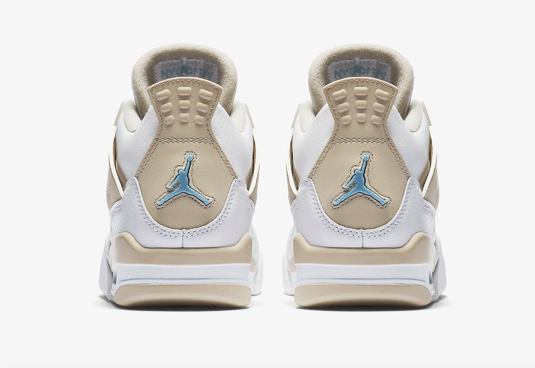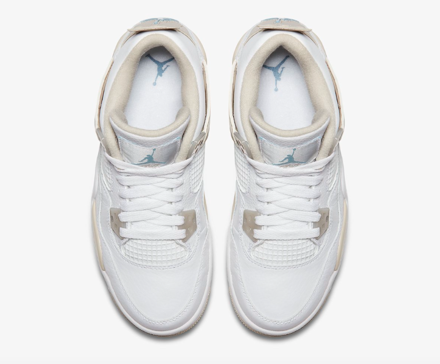 Ce n’est pas la première fois que les Air Jordan 4 GS Linen voient le jour puisqu’en 2006, Jordan Brand les avaient proposées à ses clientes, en exclusivité déjà, laissant les gros pieds des bourrins bien loin de cette version. Ces pompes s’appuient sur une empeigne en cuir poli blanc, comme le linge. Couleur qu’on voit également sur une bonne partie de la semelle, intermédiaire ou extérieure. D’où le nom de la version, surtout que ce style est confirmé par les autres teintes claires composants le modèle. On pense bien entendu au beige. On le retrouve sur une partie des œillets, la semelle intermédiaire, au niveau de la doublure intérieure ou encore à l’arrière des grolles. Enfin, les logos du Jumpman sont d’un bleu ciel et s’affichent sur la languette, sous la semelle et au-dessus du talon.