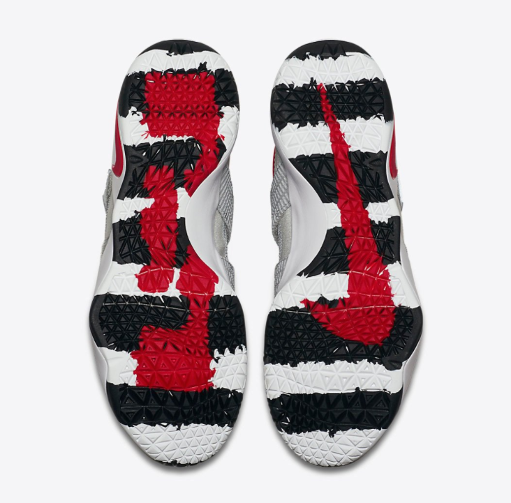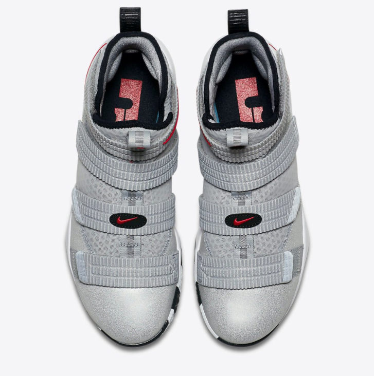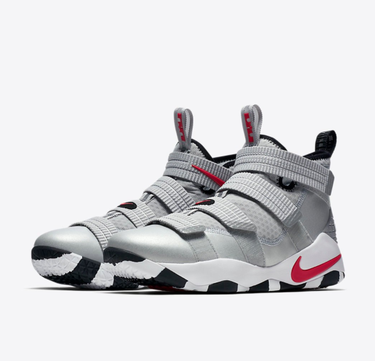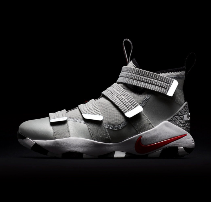 Une nouvelle version qui s’inspire de certaines des groles préférées de LeBron James, à savoir les Nike Air Max 97 Silver Bullet. C’est donc sous le même nom et en suivant le même thème que les LeBron Zoom Soldier 11 vont débarquer. À l’instar donc des Air Max, la base des pompes sont en gris métallique, de l’empeigne au talon en passant par la languette et les sangles qui remplacent les lacets. Toujours à l’image du modèle d’origine, du noir, du blanc et du rouge complètent l’ensemble en s’incrustant sur différents détails ainsi que sur la semelle. Celle-ci est zébrée entre les deux premières teintes, tout en voyant ces motifs contrariés par un énorme Swoosh et le logo de King James en rouge. Enfin, on retrouve la virgule de Nike en rouge dans un ovale noir sur la seconde sangle des Zoom Soldier, marque qui prenait place sur la languette des Air Max 97 Silver Bullet.