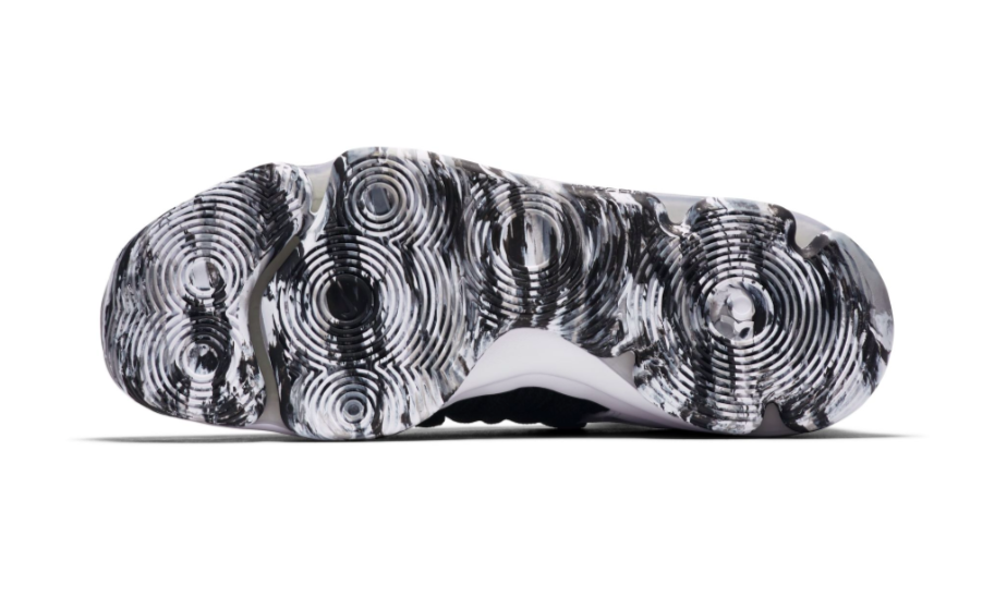 En effet, comme le nom – Black White – l’indique, ce sont ces deux teintes qui vont habiller les KD 10. Mais si on a pu voir par le passé des grolles avec une empeigne d’un ton et les semelles de l’autre, cette version des chaussures de Durantula sont bien plus originales. Si le dessus s’habille majoritairement de noir, en particulier la partie en Flyknit sur l’avant, tout l’arrière du modèle est en blanc, autour de la cheville et au niveau du talon, avec la place laissée pour le Swoosh dans la teinte sombre. La semelle intermédiaire reprend le blanc tandis que les deux couleurs se mêlent sous le pied dans un style marbré, sur une partie en gomme.