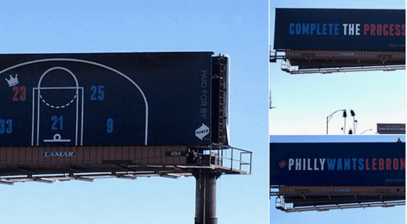 On met souvent en avant le fait que Joel Embiid est un génie pour inciter les joueurs à venir jouer à Philly (et pour tout le reste). Les rumeurs vont également bon train concernant un départ de LeBron James cet été. Mais personne n’avait vu venir ce beau coup de com réalisé par une entreprise basée dans la ville de l’amour fraternel. Des panneaux publicitaires ont donc été installés aux alentours de Cleveland pour inciter le King à venir jouer pour les Sixers l’année prochaine.