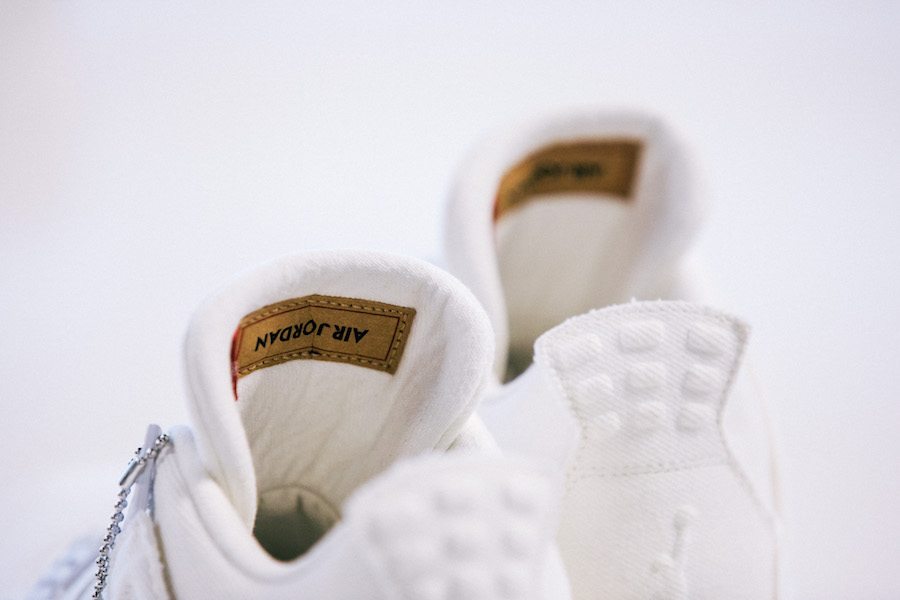 Après la première collection qui comprenait déjà une veste réversible et une paire de Air Jordan 4 de couleur bleu indigo courant janvier, on retrouve donc la même idée d’origine mais avec deux ensembles. L’un noir délavé, l’autre blanc. Pour les deux donc, les quatrièmes signature shoes de His Airness prennent un aspect denim. Chaque modèle de chaussures possède une partie supérieure monochromatique qui est complétée par une semelle en gomme et des détails rappelant le lien avec Levi’s, comme le logo sur la languette qui nous renvoie aux étiquettes des jean’s. La marque est également présente sur la semelle intérieure gauche, faisant face au Jumpman pour la droite. Chaque paire de Air Jordan 4 est donc accompagnée d’une veste réversible de la même couleur côté recto, rouge ou noire côté verso. Si sur la première face le Jumpman et l’inscription Flight sont discrètes donnant un style habillé, la seconde est plus voyante pour un aspect plus sportif.