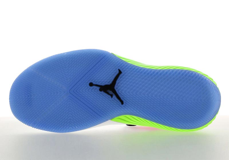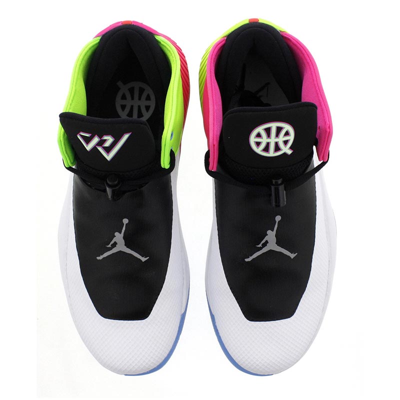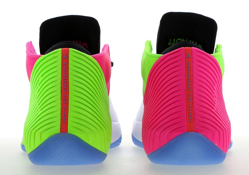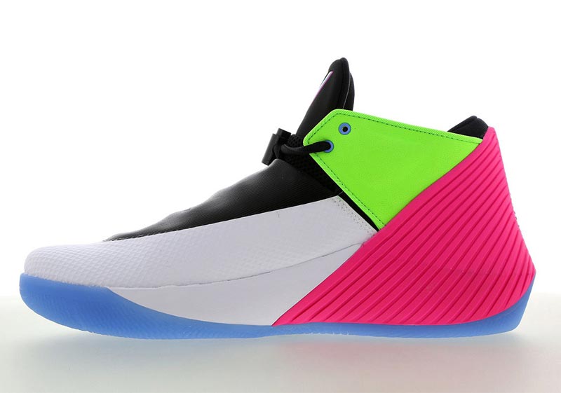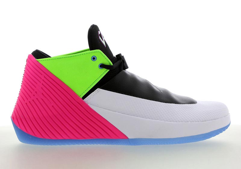 C’est le second coloris du modèle à tige basse des pompes de Russell Westbrook que nous avons l’occasion de présenter après la version Triple Black. Si on retrouve encore un peu de noir sur ces Why Not Zer0.1 Quai 54, l’ensemble est tout de même bien plus lumineux. il faut dire qu’avec un thème reprenant des teintes fluo pour le tournoi, on va forcément avoir des pompes coloriées au Stabilo. En plus du noir déjà évoqué qui prend place sur la languette, l’avant de la chaussure – du moins son contour – est en blanc. C’est ensuite au niveau du talon qu’on se fait un peu mal à la rétine puisque le pied droit est en rose alors que le gauche est en vert, dans des tons qu’on qualifiera de fluo même si sur le papier ils sont notés comme « électriques ». Au niveau de la cheville on inverse le positionnement, le vert basculant à droite et le rose à gauche. Le tout est complété par une semelle d’un bleu translucide. Au niveau des détails on notera le Jumpman grisé sur l’empeigne ainsi que les logos RW et du Quai 54 sur les languettes.