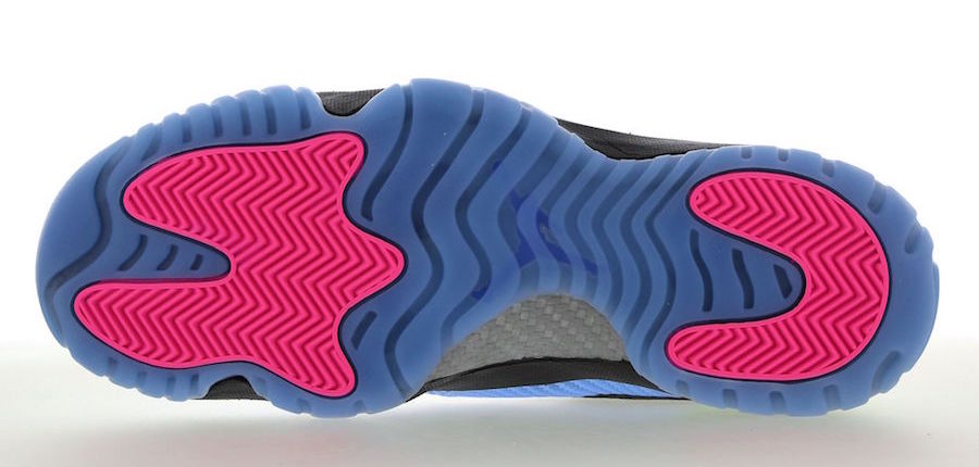On part donc sur le même thème axé sur du vert et du rose fluo, charte graphique du Quai 54 2018. Si la base de la pompe reste en noir, un contour légèrement bleuté passe par les orteils pour aller jusqu’au niveau des chevilles, au-dessus de la semelle intermédiaire qui elle reprend le noir. Les teintes fluo illuminent le tout en se plaçant sur l’arrière de la godasse pour le vert pendant que le rose s’affiche sur une bande oblique au milieu de la grole, sur le panneau extérieur. Sur l’intérieur du pied, on trouve les lacets dans leur style asymétrique caractéristique du modèle. le rose se place enfin sur le Jumpman de la languette ainsi qu’en complément du bleu translucide de la semelle extérieure.