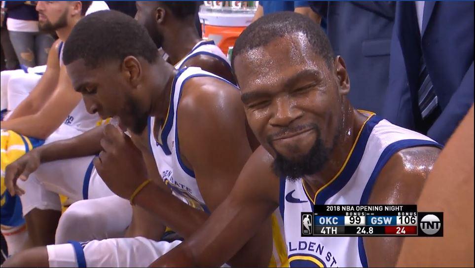 4h30 du matin, heure française. On se ressert un café et on s’installe pour le deuxième match de la nuit opposant les deux grands rivaux, les Warriors et le Thunder. Mais avant de lancer les hostilités, on a pu profiter de la cérémonie célébrant les champions et leur back-to-back, dirigée par Adam Silver en personne, s’il vous plaît. Que retenir de ce moment (qui a dû paraître interminable pour ceux qui ne portent pas les Warriors dans leur cœur) ? A vrai dire, la cérémonie n’avait rien de bien différent des autres et elle a permis de rajouter une bague aux mains des Californiens, mais il y a bien un détail sur lequel il faut s’attarder. Les joueurs étant appelés les uns après les autres, tout le monde s’attendait à voir Stephen Curry s’avancer en dernier, étant le leader de la franchise, normal quoi. Et bien non, c’est Kevin Durant qui a été appelé en dernier et on se doute que ce détail n’est pas anodin puisqu’il traduit une certaine séduction de la part de la franchise envers le double MVP des finales, afin de le convaincre de rester dans la Baie en 2019. C’est dans ce genre de clin d’oeil que la différence peut être réalisée.