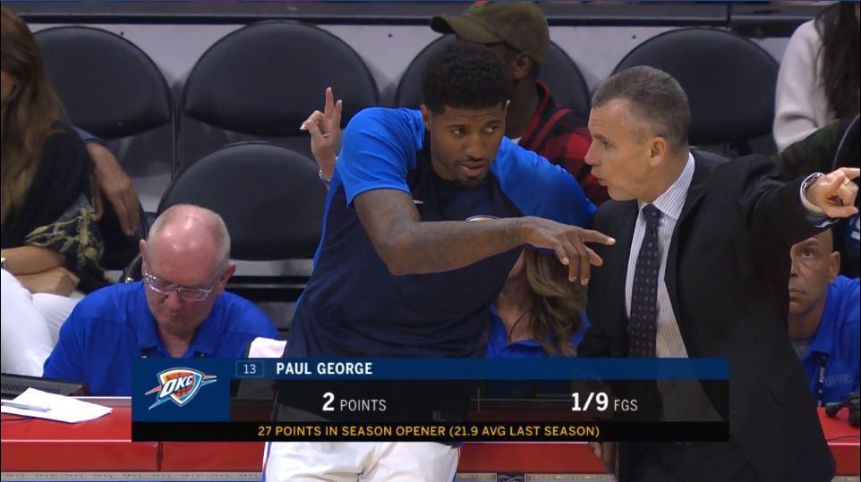 On peut voir deux alternatives à cette prise de position venant de George : d’une part, il n’est pas très système et il préfère jouer à l’instinct, s’il doit porter la balle, il le fait sinon ça attendra, mais d’un autre côté on se dit que si le joueur veut sortir des actions mises en place par son coach, c’est qu’il n’y a pas de fumée sans feu. Billy Donovan n’est pas un très grand coach, on ne va pas en choquer beaucoup en disant ça : son rôle a toujours semblé se limiter aux rapports humains et on a encore beaucoup de mal à lire son plan de jeu, hormis l’idée de mettre une grosse intensité physique dans chaque rencontre. Il a toutefois le mérite d’avoir mieux réparti la balle cette année, ce qui devenait une urgence au vu de l’hyper-dépendance à Westbrook, et le bon début de saison de l’équipe doit lui être en partie crédité puisqu’il a su libérer son ailier All-Star qui régale à chaque sortie pour un résultat qui se voit dans ses stats : 25 points, 8 rebonds, 4 passes et 2 interceptions, ses meilleurs chiffres en carrière dans les quatre catégories.