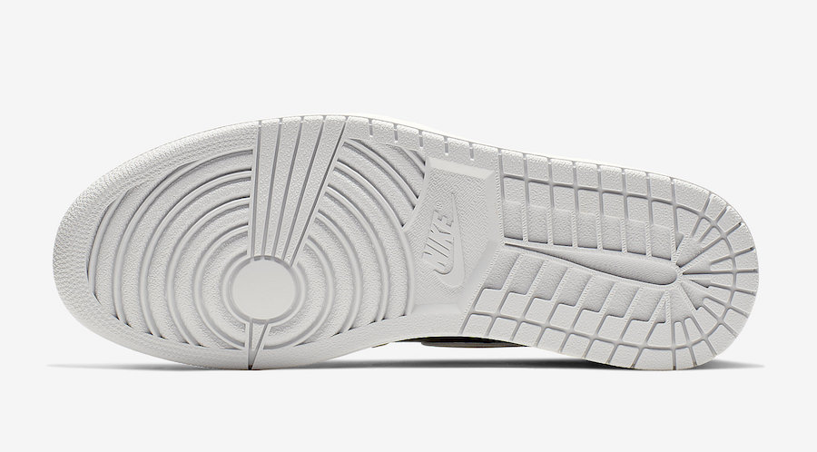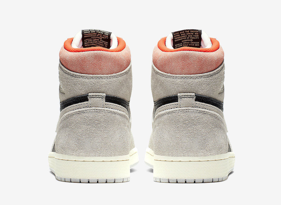 C’est donc sans surprise qu’on voit que cette version s’appuie principalement sur du gris, teinte qui habille le cuir suède de la partie supérieure des Air Jordan 1. Le reste de la base de la chaussure – la languette, les lacets et les panneaux latéraux – sont en cuir et dans un noir, plus traditionnels. Au niveau de la cheville, c’est du orange, délavé à l’extérieur, qui prend place. La semelle intermédiaire est blanche tandis que sous le pied, on retrouve du gris sur la gomme. On notera enfin l’inscription « SP 19 Air Jordan 1 High OG » à proximité de la semelle.