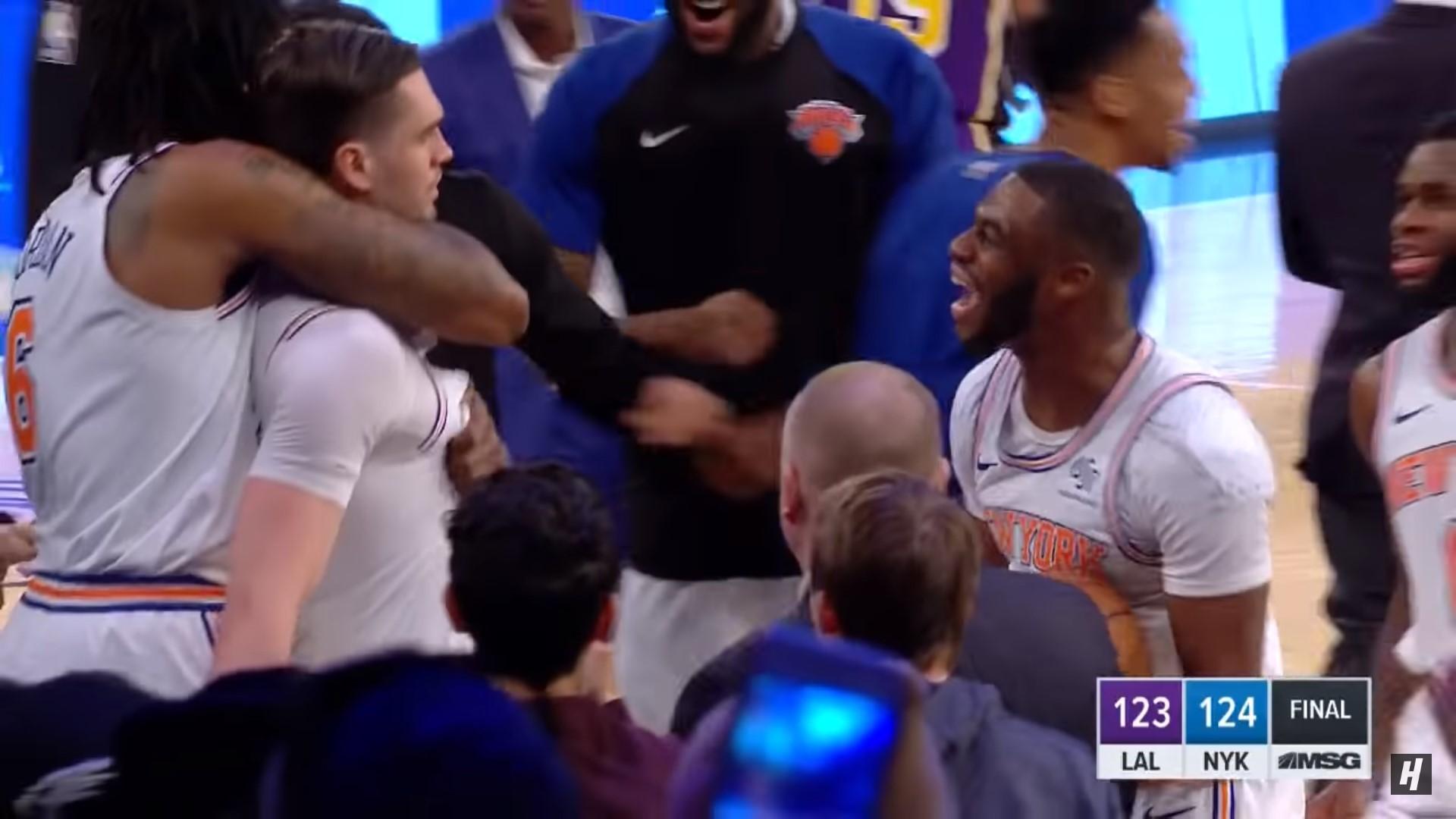 LeBron James est dans son match, du moins sur la partie adverse du terrain. Il shoote beaucoup (trop ?) et maintient ses Lakers devant, bien aidé par les revenants Alex Caruso et Johnathan Williams. Oui oui, les deux joueurs habitués à la G-League font encore une fois du bon taf en montrant beaucoup d’envie, contrairement à certains. Quant au King, il est en 33/6/8 mais il force tellement qu’on se demande s’il fait confiance à un seul de ses coéquipiers… Toujours est-il qu’il offre 11 points d’avance aux Lakers à moins de quatre minutes de la sirène et qu’on se dirige tranquillement vers une victoire purple and gold… ou pas. Il faudra que Luke Walton nous explique si ses joueurs ont un bouton pause mais quand il reste 3:45 au chrono, c’est qu’il y a encore 3:45 à jouer ! Dédé Jordan sur un alley-oop puis sur la ligne, Dotson par deux fois et Mario Hezonja à longue distance et bim, c’en est quasiment fini de l’avance des Lakers. LeBron James a certes la balle pour tuer le match à 123-122 pour LA mais c’est raté ! Mudiay remonte le terrain, subit une faute lambda de Kentavious Caldwell-Pope, sauf que les Knicks sont dans le bonus. Direction la ligne des lancers francs, Knicks by 1 ! Forcément, la dernière chance est pour le King, et là on va avoir l’action la plus WTF de la saison. Sur la dernière possession, LeBron James se fait contrer méchamment par Mario Hezonja. On répète : le meilleur joueur du monde s’est fait bâcher par MARIO HEZONJA, un mec qui n’était même pas titulaire aux Knicks avant le départ de Tim Hardaway Jr., c’est dire.