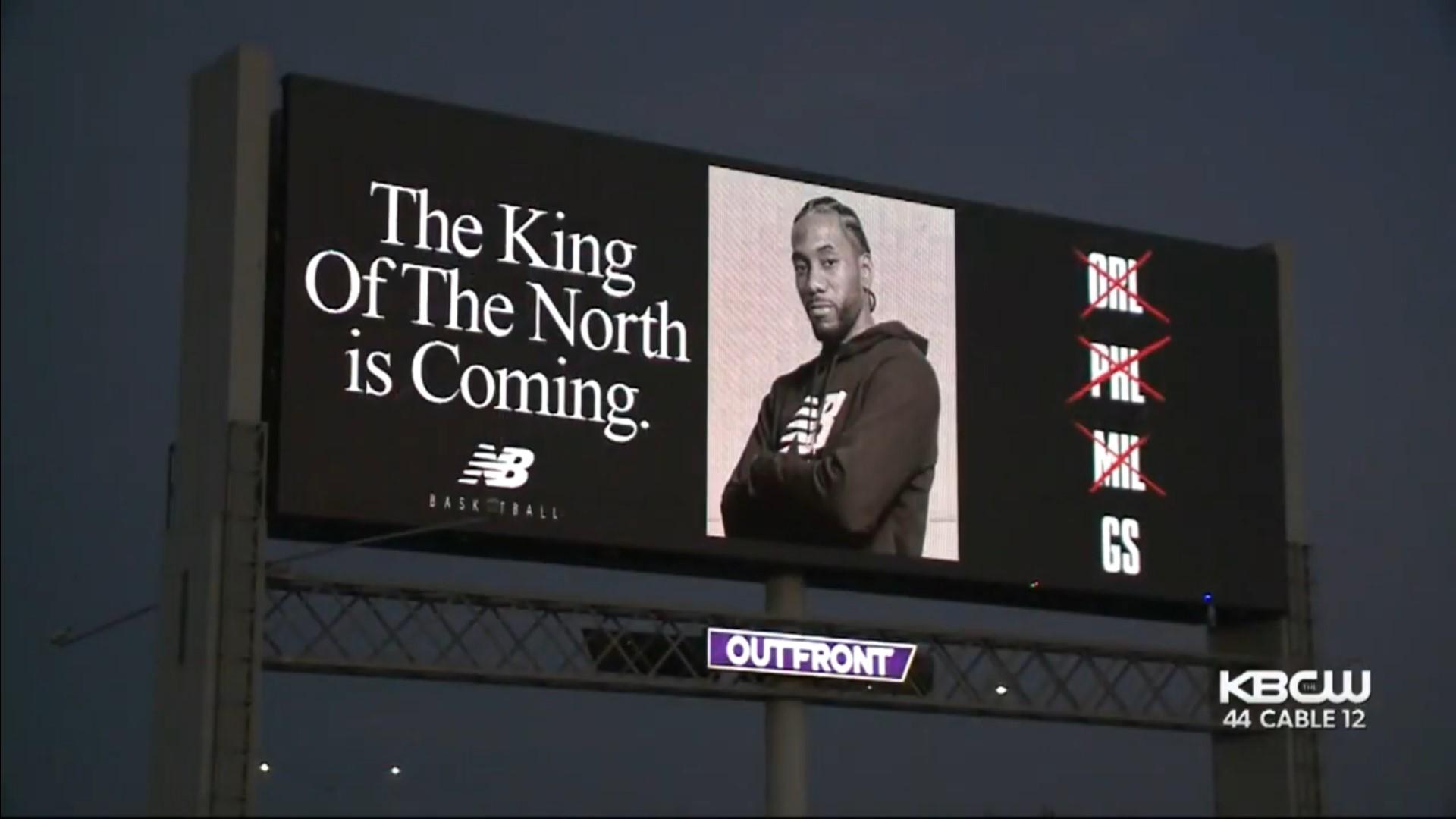 Après notre ami Drake qui est complètement en roue libre en ce moment, c’est au tour de l’équipementier New Balance de taquiner Golden State. Alors que les habitants d’Oakland se remettaient doucement de la défaite de leur équipe lors du Game 1 face à Toronto, ils ont probablement remarqué ce petit détail sur le bord des autoroutes locales. La marque américaine New Balance a en effet décidé de jouer la carte de la provoc’, en affichant la tronche de sa star Kawhi Leonard sur de grands panneaux publicitaires dans la ville des Warriors. On imagine plutôt bien la tête des types au volant de leur voiture, qui grimaçaient encore en se remémorant la performance de Pascal Siakam and co, et qui sont tombés nez à nez avec la grosse tête de Kawhi, chez eux, limite en train de sourire (oui oui). Sur ces panneaux, un message plutôt explicite accompagne l’ailier : le Roi du Nord arrive, et après avoir roulé sur Orlando, Philly et Milwaukee, la prochaine victime pourrait bien être la franchise de la Baie.