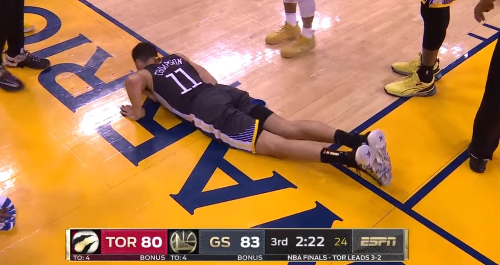 Nous sommes dans le troisième quart-temps, avec un peu plus de deux minutes à jouer. Les Warriors mènent de trois points grâce notamment à un magnifique Klay Thompson, auteur de 28 pions jusqu’ici à 8/12 au tir dont 4/6 du parking. Autrement dit, une nouvelle perf de bonhomme de la part du Splash Bro. A ce moment-là, on se dit qu’on est sur un Klay Game. Sauf que la rencontre bascule quand Stephen Curry sert Thompson en transition suite à un turnover de Kyle Lowry. L’arrière de Golden State décide de monter au dunk mais Danny Green fait faute. Klay s’écroule et se tient immédiatement le genou. Il reste au sol, le public de l’Oracle Arena retient son souffle sans oublier de scander son prénom pour l’encourager. On parle là d’un véritable battant, d’un mec qui ne rate quasiment jamais un match. Quand Thompson reste à terre, c’est que c’est sérieux. Alors forcément, tout le monde flippe, surtout en voyant le sniper rejoindre les vestiaires. Le problème, c’est que s’il ne tire pas ses lancers francs, il ne peut pas rejouer plus tard dans la rencontre. Et ça évidemment, Klay ne veut pas l’imaginer une seule seconde. C’est un Game 6 de Finales NBA, les Warriors sont dos au mur, Kevin Durant est à l’hosto et Golden State a plus que jamais besoin de lui pour rester en vie. Tout ça, ça lui passe par la tête. Du coup, Thompson décide de revenir en jeu, sur une jambe.