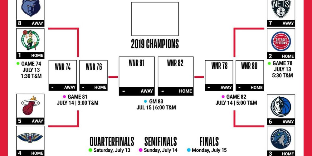 Ce sont les Celtics qui partiront favoris du tournoi cette année. Portés par Carsen Edwards et Grant Williams, ils ont terminé la phase régulière sans aucune défaite. Ils affronteront Memphis au premier tour sans Ja Morant, mais avec Brandon Clarke qui galère d’ailleurs depuis le début de l’été. De l’autre coté du bracket, les Pistons qui ont terminé deuxièmes avec une équipe de « vétérans » menée par Bruce Brown (paie ton vétéran) affronteront une autre team très expérimentée niveau NBA avec notamment le détenteur de l’afro la plus stylée en NBA depuis Ben Wallace, Jarrett « J’ai plusieurs superstars à mon tableau de chasse » Allen. Mais l’équipe la plus fun à regarder durant cette Summer League, ce sont les New Orleans Pelicans, même sans Zion Williamson. C’est Jaxson Hayes qui fait kiffer tout le monde du coté de la Big Easy. Lui et ses coéquipiers affronteront le Heat de Tyler Herro qui s’éclate lui aussi à Vegas. Enfin, la dernière match-up #3 vs #6 opposera les Wolves sans Jarrett Culver et les Mavs avec… Cameron Payne.