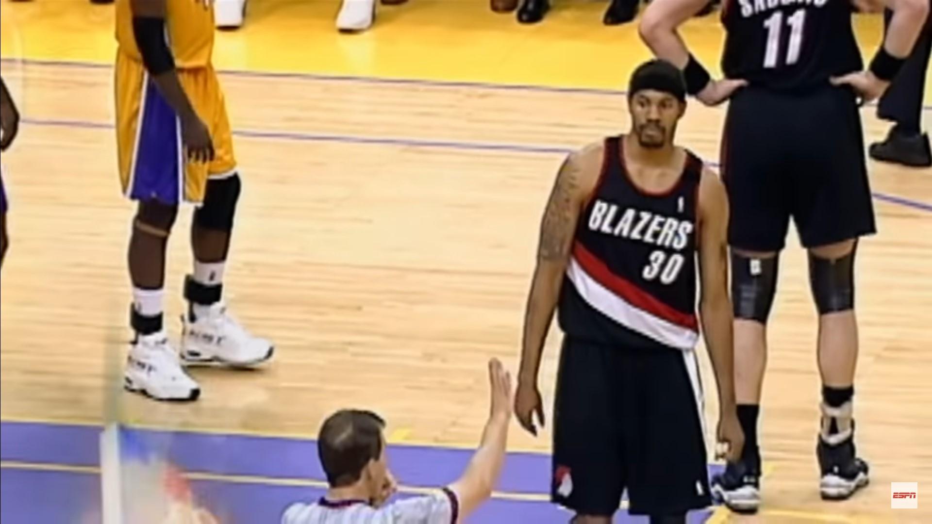 Parmi ses 317 fautes techniques, il y en a une qui est particulièrement restée dans les mémoires et ce pour plusieurs raisons. Déjà, c’était quasiment sur la plus grande scène du basket NBA, lors du Game 1 des Finales de Conférence Ouest entre les Lakers et les Blazers en 2000. Ensuite, c’est parce que cette faute technique s’est transformée en expulsion étant donné que Rasheed Wallace avait déjà été sanctionné durant la rencontre. Enfin, et c’est surtout pour cette raison, le Sheed a réussi à se faire éjecter sans dire le moindre mot. Et ça, il faut le faire quand même. Pour réussir cet exploit, il faut posséder une sacrée réputation dans le domaine de la faute technique, et on peut dire que Wallace était au sommet à ce niveau-là. Allez, on vous refait la scène dans son intégralité car c’est mythique. Après avoir pris une première technique dans le deuxième quart-temps pour contestation alors qu’il était assis le long de la ligne de fond, Rasheed est à la limite de l’exclusion, notamment suite à un dunk où il n’a pas hésité à montrer son mécontentement envers l’arbitre. Et cette exclusion, elle va arriver au milieu du troisième quart. Suite à une faute de Kobe Bryant sur Scottie Pippen, Wallace regarde l’arbitre Ron Garretson pendant quelques secondes, sans rien dire. L’officiel prend cela comme une provocation et dégaine. « Whack ! Get Out ! », deuxième technique pour le Sheed, direction les vestiaires. Le joueur de Portland Steve Smith demande tout de suite des explications à l’arbitre, qui confirme que Wallace n’a rien dit du tout. Après un « get away from me Steve » légendaire, Garretson lui explique que Rasheed a enchaîné les provocations en le regardant de travers à plusieurs reprises pour l’intimider. C’était la fois de trop.