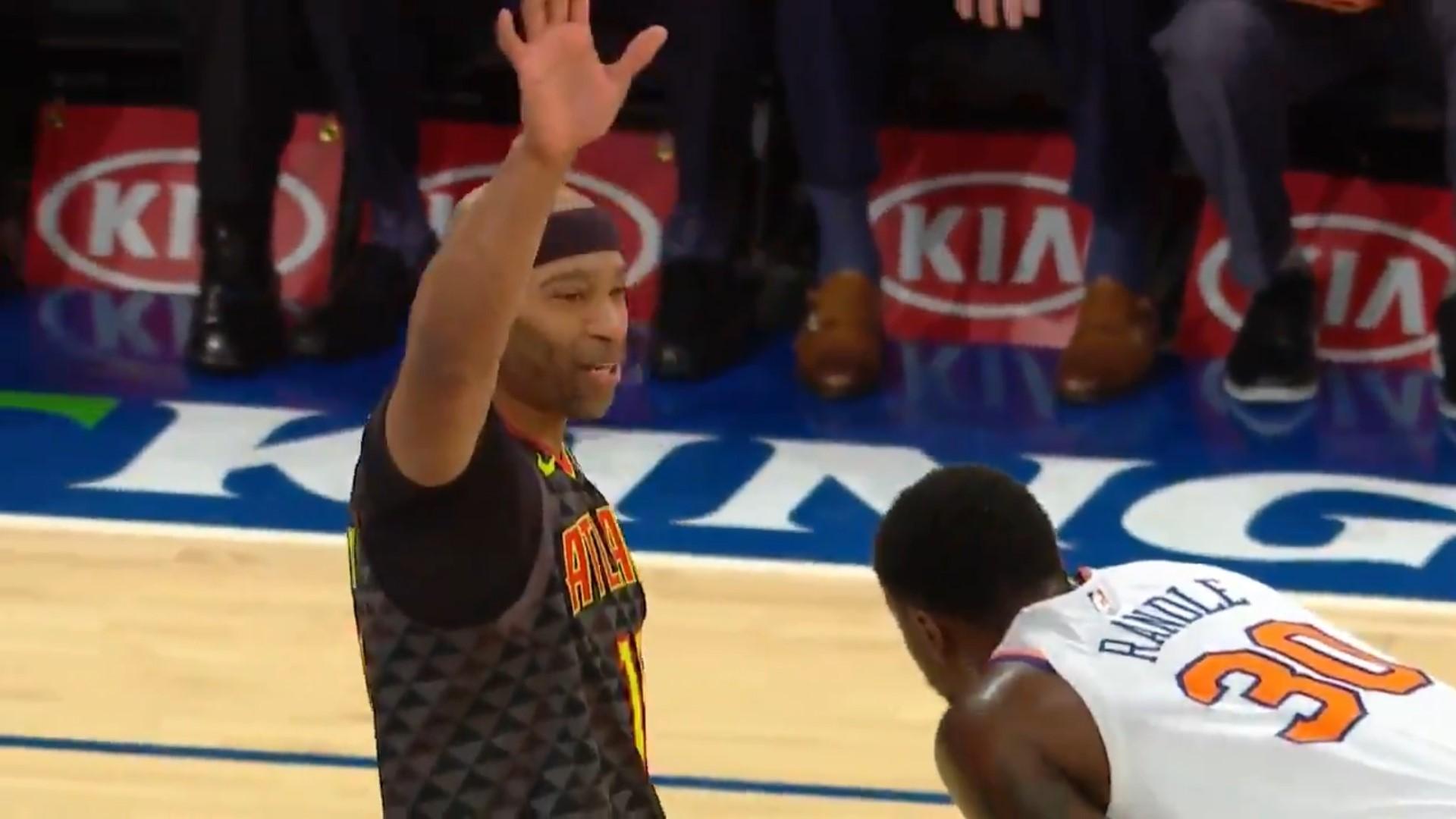 1 504 rencontres au total, en 22 saisons. Un chiffre exceptionnel, un chiffre rare. Arrivé en NBA en 1998 et toujours là à bientôt 43 ans, Vince Carter est un modèle de longévité et de professionnalisme. Il est aujourd’hui le recordman du nombre de saisons jouées dans la Grande Ligue et il profite de sa dernière campagne en carrière pour passer devant des légendes du jeu. Comme indiqué juste au-dessus, c’est John Stockton qui va désormais devoir laisser sa place à Vinsanity. Après la rencontre entre les Knicks et les Hawks la nuit dernière, les deux sont aujourd’hui à égalité au nombre de matchs joués, mais Carter va prendre seul la quatrième place dans quelques jours, à moins que Stockton ne sorte subitement de sa retraite à 57 balais pour compenser les petits bobos de Mike Conley. Vous en conviendrez, ça semble peu probable comme scénario. Et comme le hasard fait bien les choses, Atlanta affrontera… Utah, l’ancienne franchise de John, lors de son prochain match jeudi. VC continue donc de grimper dans la hiérarchie et en plus, c’était sur le parquet du mythique Madison Square Garden, qu’il a foulé pour la toute dernière fois de sa carrière la nuit dernière. Les Hawks ne reviendront plus jouer à New York cette saison et le public new-yorkais en a ainsi profité pour applaudir le papy. Forcément, VC a kiffé le moment, et visiblement il a été inspiré car il a terminé avec 15 points en 24 minutes face aux Knicks, à 5/9 au tir et 4/7 du parking.