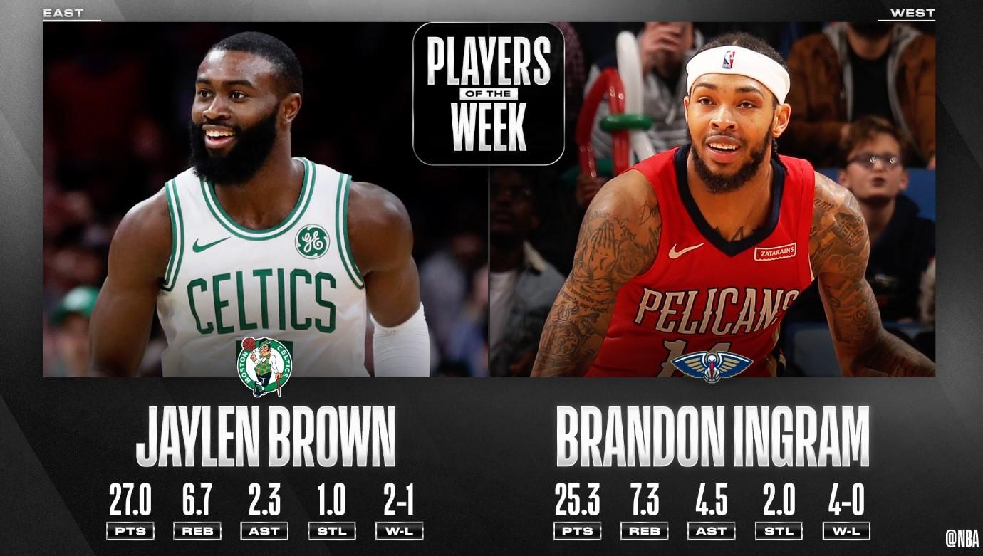 Grâce à leurs prestations depuis le début de la saison, Jaylen Brown et Brandon Ingram font partie des candidats pour le titre de Meilleure Progression de l’Année. Tous les deux évoluent actuellement dans leur quatrième saison NBA et on peut dire qu’ils cartonnent, eux qui terminent 2019 en trombe. Commençons par Jaylen. Le joueur des Celtics, sélectionné avec le troisième choix de la Draft 2016, a d’abord marqué les esprits à Noël avec une superbe perf à 30 points sur le parquet des Raptors. On s’en rappelle, il a éclaboussé de son talent le début du Christmas Day avec des moves bien kiffants. Sur un petit nuage et en pleine confiance, il a enchaîné contre les Cavaliers avec 34 pions au compteur. Moins en vue contre Toronto samedi, Brown a quand même terminé la semaine avec des moyennes de 27 points et 6,7 rebonds à 62,2% au tir dont un très gros 57,9% du parking. Les Celtics ont remporté deux matchs sur trois sous son impulsion, et ce titre de joueur de la semaine est d’ailleurs une grande première pour Jaylen.