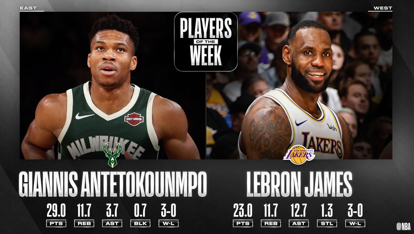 Dans le top 2 de la course au MVP pour beaucoup de monde sur cette première partie de saison, Giannis Antetokounmpo et LeBron James viennent d’être récompensés par la NBA. Ils ont tous les deux été nommés joueurs de la semaine suite à leurs récentes performances. Voilà, c’est tout.