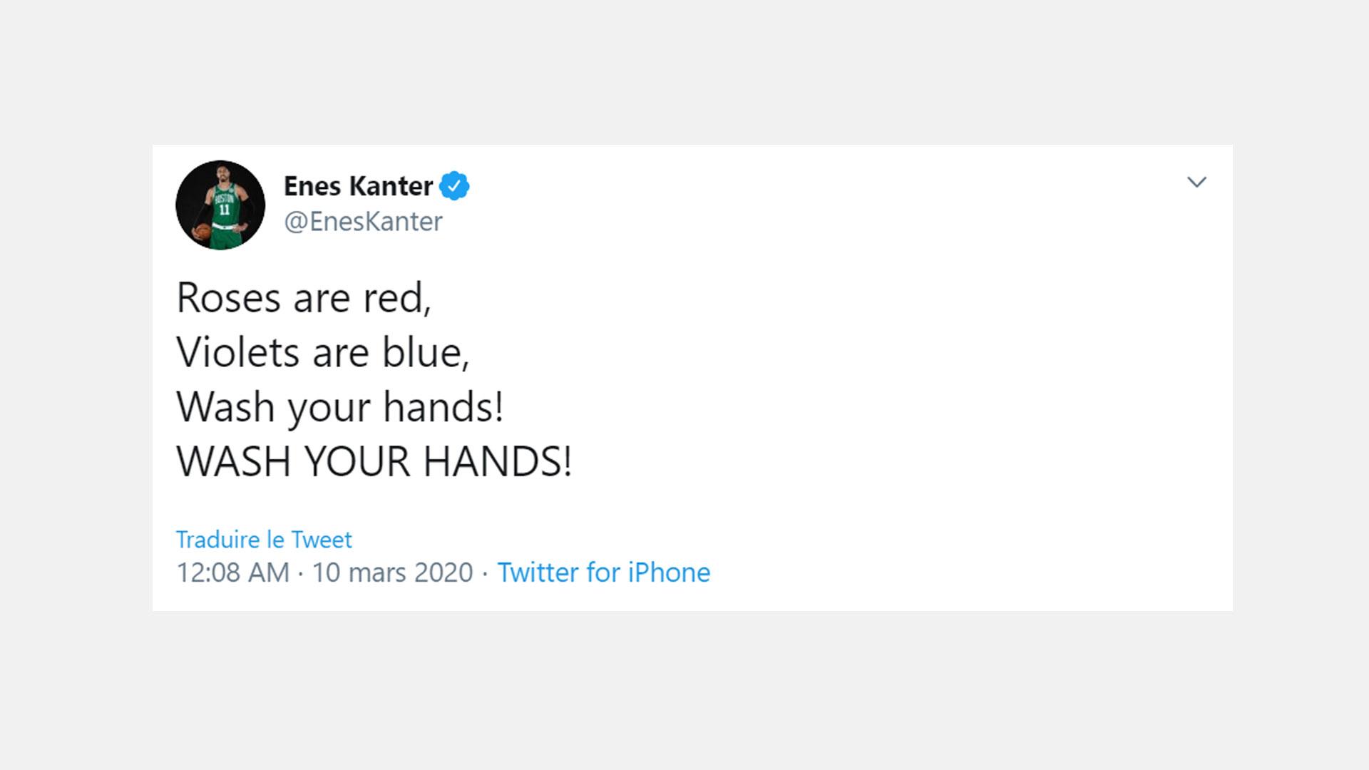L’idée de reporter certains matchs est également une possibilité même si les salles des franchises accueillent aussi de nombreux spectacles et que réserver une autre date n’est pas aussi facile que cela. En attendant de nouvelles annonces de la NBA, vous pouvez suivre à la lettre les conseils d’Enes Kanter. Lavez-vous bien les mains !