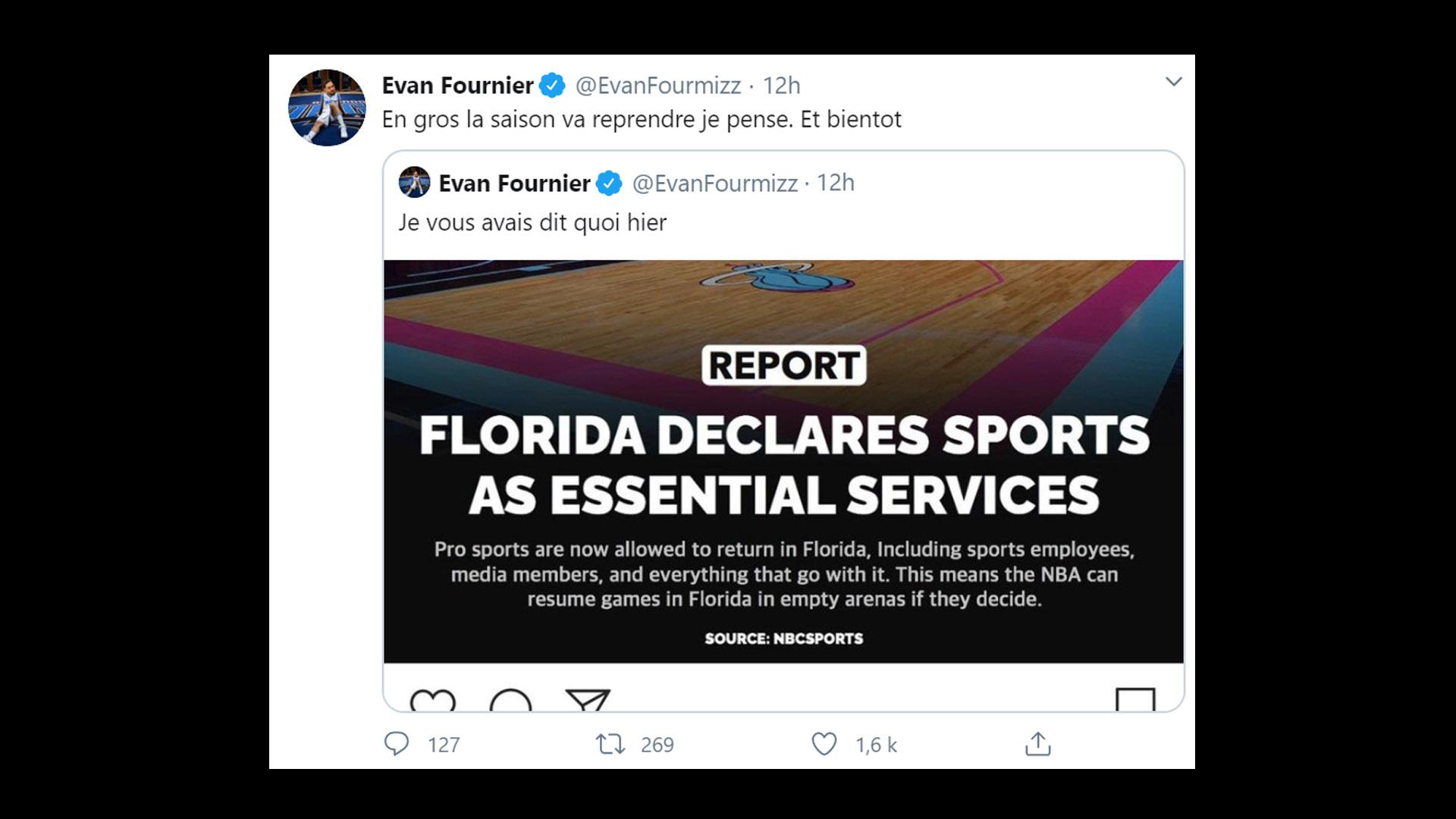 Si les US devaient utiliser une attestation de sortie comme la nôtre, Evan Fournier pourrait donc cocher la case qui certifie que son travail est d’utilité générale pour justifier ses déplacement en dehors de son domicile. En effet, la Floride est le premier état à déclarer le sport professionnel comme un service essentiel, autorisant tous les employés de clubs professionnels, les athlètes et les médias à reprendre leur travail à condition que les salles restent vides. En d’autres termes, un match de NBA peut désormais légalement se jouer à huis-clos dans l’état du sud. Une décision qui semble précipitée mais qui doit surtout permettre à l’activité de ne pas s’arrêter totalement tout en proposant du divertissement aux populations qui doivent restent chez elles. De quoi donner des idées à Adam Silver qui devra quand même peser le pour et le contre d’une éventuelle reprise de la saison dans un lieu neutre de Floride par exemple. En tout cas selon notre twittos préféré vivant sur place, la campagne 2019-20 devrait reprendre rapidement.