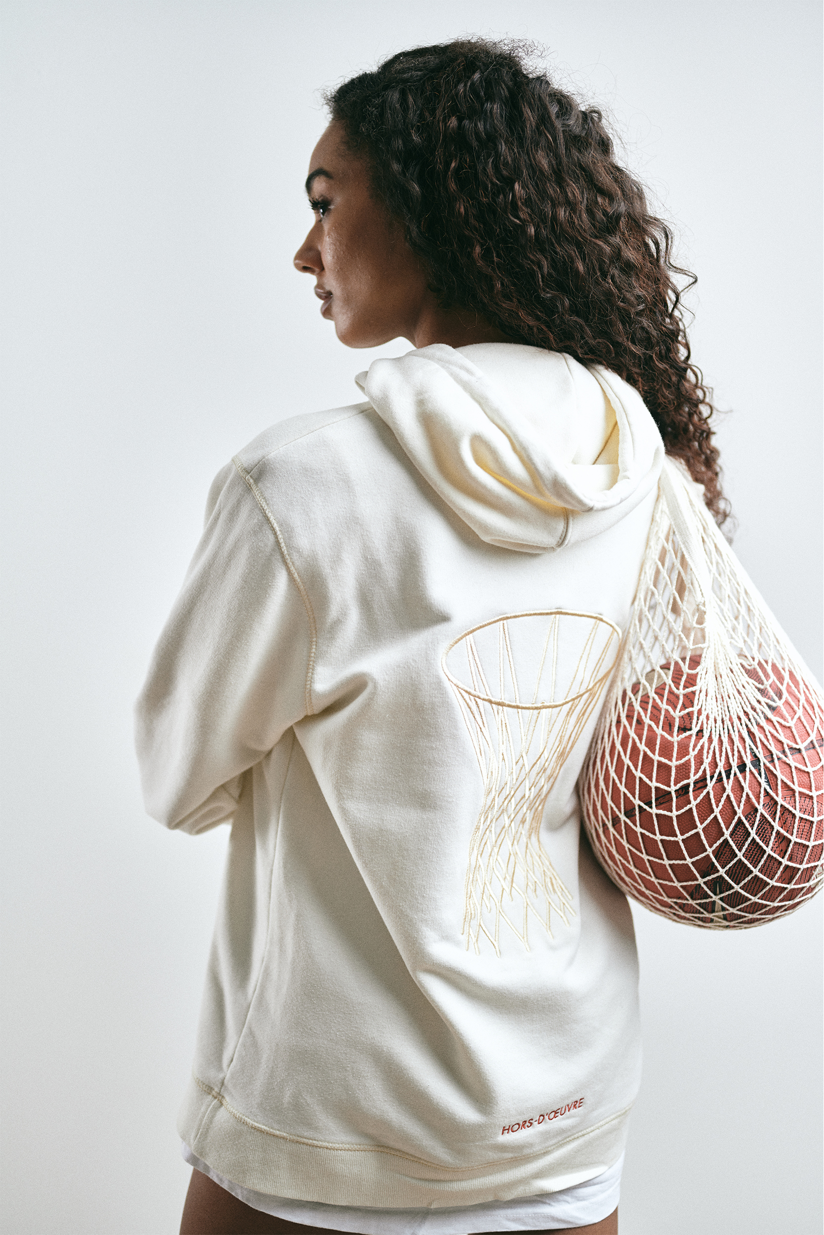 GY : Ce concept nous est venu parce que notre vie a toujours tourné autour du basket et du style de vie américain. On a voulu y rajouter un peu de classe à la française. On a décidé de l’appeler HORS-D’ŒUVRE comme un clin d’oeil au savoir-faire français, apporter ce côté classe. Je viens de Dreux donc nos créations rappellent aussi mon côté urbain. Florian et Martin viennent eux de la Côte Roannaise et ramènent cette touche gastronomique. On essaye vraiment de s’inspirer des environnements dans lesquels on a grandi pour nous créer une identité propre et partager l’art du basket de manière subtile.
