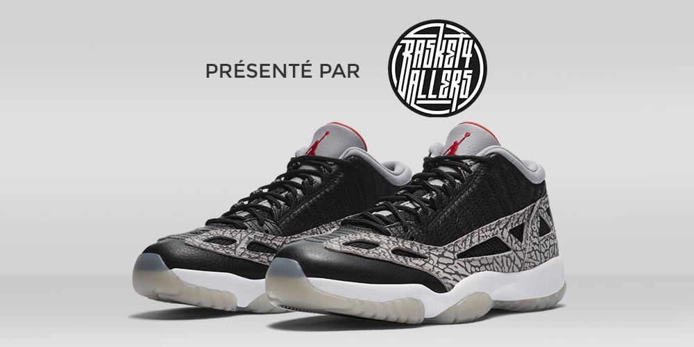 Procurez-vous maintenant sur Basket4Ballers.com la Air Jordan 11 Low IE dans un coloris « Black Cement » fabriquée avec des materiaux légers et respirants et agrémentée du mythique Elephant Print.