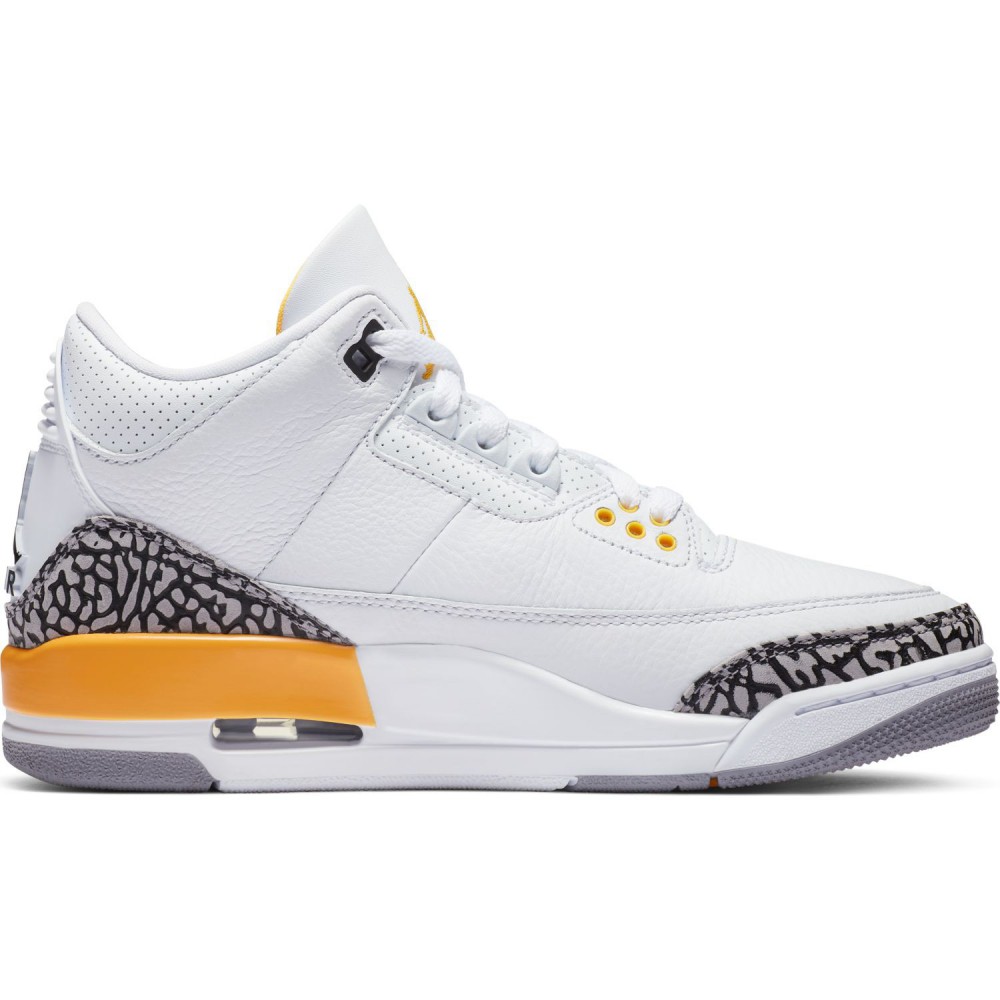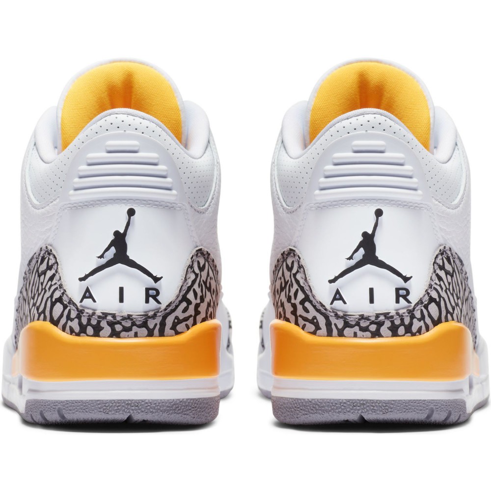 Michael Jordan était très très fort sur le terrain. Genre dominant le type, et quand il a fallu recruter des créateurs pour imaginer les paires qui seraient aux pieds de la terre entière, MJ s’est bien assuré que les personnes qu’il a engagées sont les meilleures dans leur domaine. Et bien il ne s’est pas trompé, car encore une fois, son équipe de design offre une version rafraîchissante de la Air Jordan 3 pour finir l’été et reprendre le chemin de l’école ou de son lieu de travail. Et là, ce sont bien les filles qui profiteront de la forte compétence du Jumpman. Une empeigne blanche en cuir haute qualité, le gage de la qualité pour la marque. Comme chaque robe de la AJ3, la chaussure conserve ses empiècements avant et arrière au motif camouflage gris noir qui font la légende du modèle. La semelle intermédiaire est jaune au niveau du talon, ça rappelle l’été, tous les souvenirs de soirée (snif) et ça permet d’apporter une petite dose de couleur. Le jaune est aussi présent au niveau des lacets, à l’intérieur de la languette et habille Jumpman à l’extérieur de cette dernière. Pour tous ceux qui n’ont pas encore eu leur dose du numéro 23 de Chicago, son logo est aussi présent au talon, sur le renfort en dur, histoire de finir de montrer à quel clan vous appartenez.