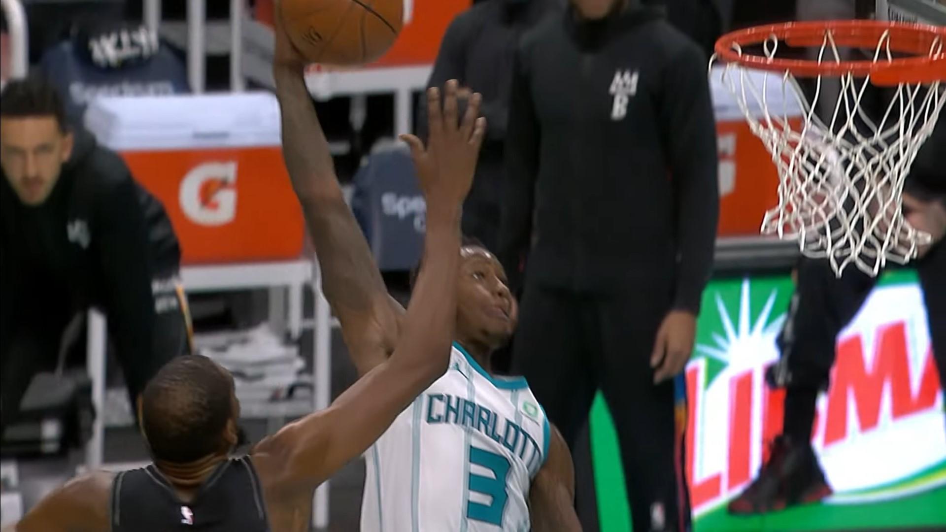 #1 : décidément, soirée compliquée pour KD. Après P.J. Washington, c’est Terry Rozier qui se farcit Kevin avec un très gros tomar en contre-attaque. Bang !