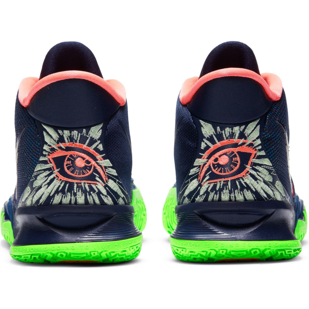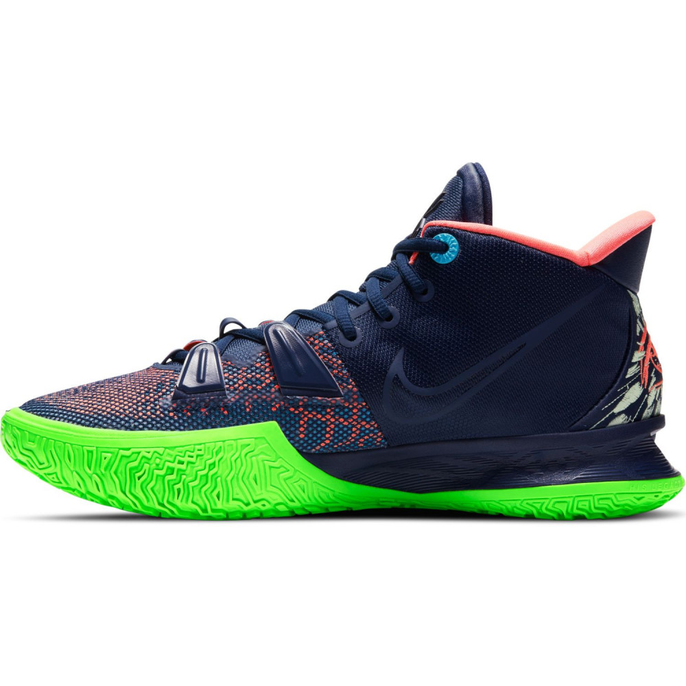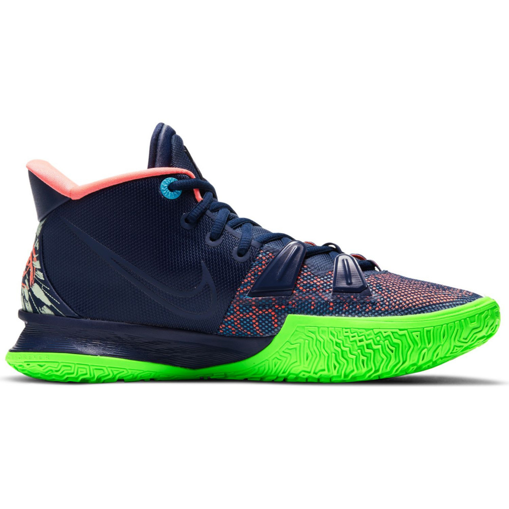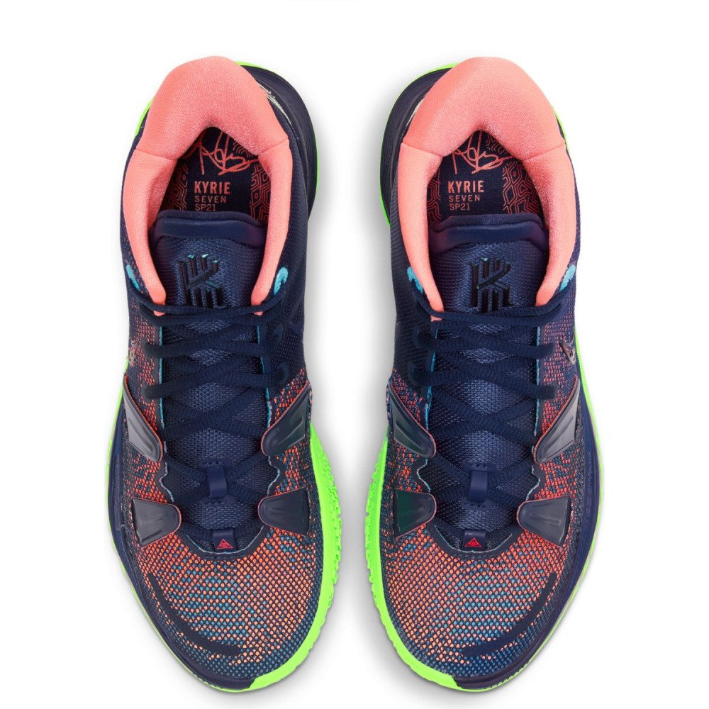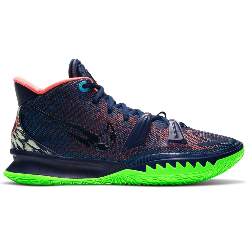 Mais quand il pose son bâton de pèlerin au vestiaire, Uncle Drew opte parfois pour un style plus flashy sur les parquets. En tout cas, ce ne sont pas les petites dernières qui nous feront dire le contraire. On passe tout de suite aux présentations avec la Nike Kyrie 7 Anime. Pas la peine de refaire la description de la silhouette, on a affaire à un classique pour les sneakerheads. Au niveau des couleurs, c’est évidemment la semelle verte fluo qui tape à l’oeil en premier. Mention aussi pour l’intérieur rose de la paire et le petit œillet bleu, ce qui nous donne les trois couleurs primaires dans le monde du digital. Enfin, l’empeigne mouchetée rouge et bleue et les inévitables yeux au niveau du talon complètent un tableau haut en couleur, comme le style de jeu du champion NBA 2016.
