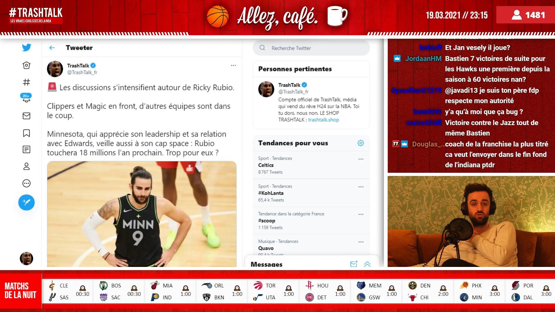 Une émission live sur Twitch, des débats sur l’actualité, un point sur les dernières infos et rumeurs, des Woj bombs en direct… pas de doute, le rendez-vous du soir spécial trade deadline est un incontournable d’ici au 25 mars. Et dans l’émission d’hier soir, on a fait un point sur les rumeurs qui ont animé notre vendredi : John Collins, Aaron Gordon, Ricky Rubio… y’a du monde. Pendant plus d’une demi-heure, on analyse les différents dossiers un par un, histoire de ne rien rater et d’être au courant des infos qui viennent de sortir du four. Bref, c’est the place to be avant de partir comme d’habitude sur les matchs de la nuit.