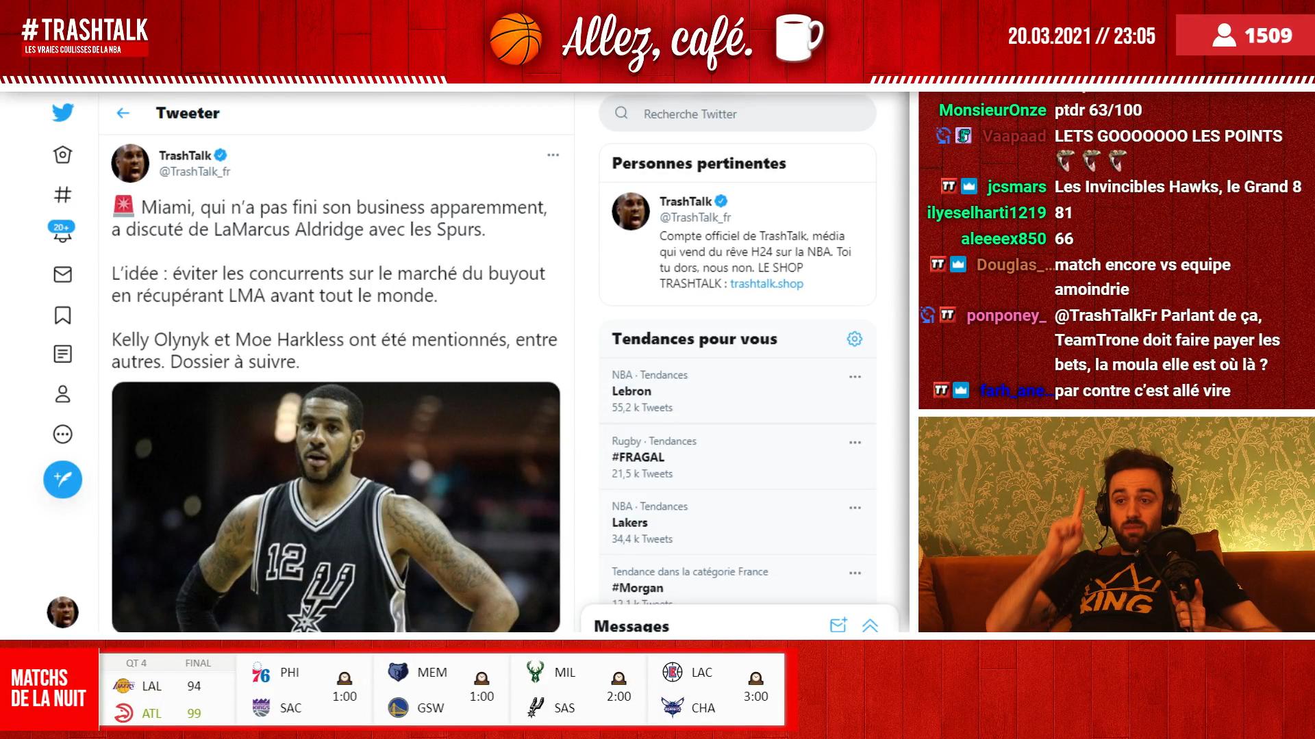 Une émission live sur Twitch, des débats sur l’actualité, un point sur les dernières infos et rumeurs, des Woj bombs en direct… pas de doute, le rendez-vous du soir spécial trade deadline est un incontournable d’ici au 25 mars. Et dans l’émission d’hier soir, on a fait un point sur les rumeurs qui ont animé notre début de week-end : LaMarcus Aldridge toujours, les Celtics très actifs alors que les Nets ne sont pas encore satisfaits et pourraient échanger Spencer Dinwiddie, out jusqu’à la fin de la saison, pour arriver en Playoffs avec du très lourd. Après 2h30 de commentaire de match et la blessure de LeBron James vécue en direct, on analyse les différents dossiers en vitesse, histoire de ne rien rater et d’être au courant des infos qui viennent de sortir du four. Bref, c’est the place to be avant de partir comme d’habitude sur les autres matchs de la nuit.