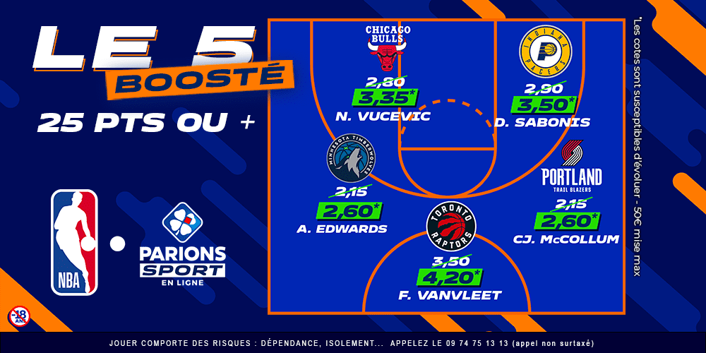 Amis parieurs, amies parieuses, l’heure est venue de se mouiller. En ce lundi 25 octobre, c’est un joli petit programme que nous offre la NBA avec neuf matchs au menu. Cela offre de nombreuses opportunités pour se faire plaisir avec un petit pari, et aujourd’hui on a décidé de vous proposer cinq cotes boostées histoire de varier les plaisirs tout en augmentant encore plus vos gains en cas de pari gagnant.