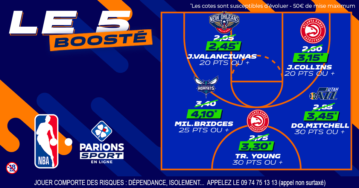 Amis parieurs, amies parieuses, l’heure est venue de se mouiller. En ce lundi 22 novembre, c’est un joli petit programme que nous offre la NBA avec dix matchs au menu. Cela offre de nombreuses opportunités pour se faire plaisir avec un petit pari, et aujourd’hui on a décidé de vous proposer cinq cotes boostées histoire de varier les plaisirs tout en augmentant encore plus vos gains en cas de pari gagnant.