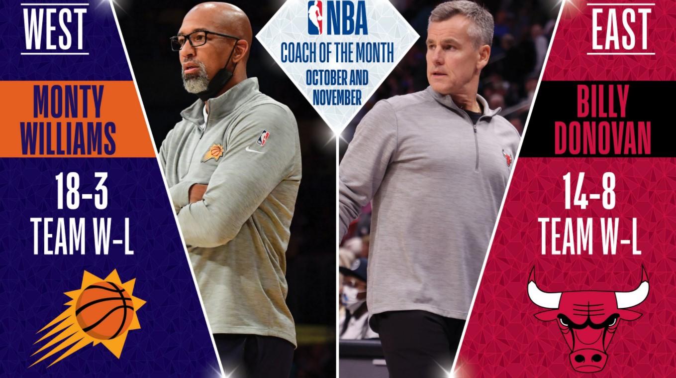 Phoenix Suns head coach Monty Williams and Chicago Bulls head coach Billy Donovan have been named the NBA Western and Eastern Conference Coaches of the Month, respectively, for games played in October and November. pic.twitter.com/Fd6MRq64g1