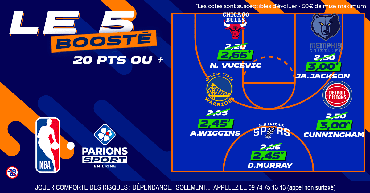 Amis parieurs, amies parieuses, l’heure est venue de se mouiller. En ce lundi 6 décembre, c’est un joli petit programme que nous offre la NBA avec dix matchs au menu. Cela offre de nombreuses opportunités pour se faire plaisir avec un petit pari, et aujourd’hui on a décidé de vous proposer cinq cotes boostées histoire de varier les plaisirs tout en augmentant encore plus vos gains en cas de pari gagnant.