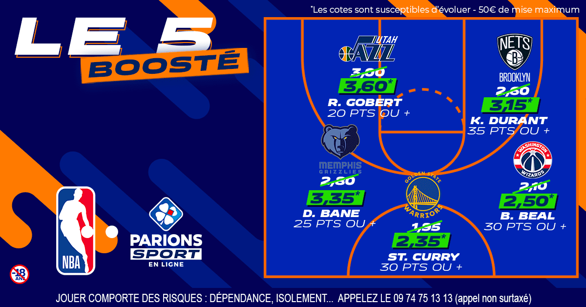 Minimum 35 points : Kevin Durant contre les Grizzlies (3,15 au lieu de 2,60) : Kevin Durant n’était vraiment pas content après la défaite de Brooklyn samedi face à des Clippers largement diminués. Y’a donc moyen qu’il revienne bien énervé contre une équipe de Memphis qui pourrait prendre cher. KD peut planter 35 pions contre n’importe qui mais on souligne quand même le fait que les Grizzlies sont redevenus une équipe vraiment solide en défense ces dernières semaines. Pas gagné donc.