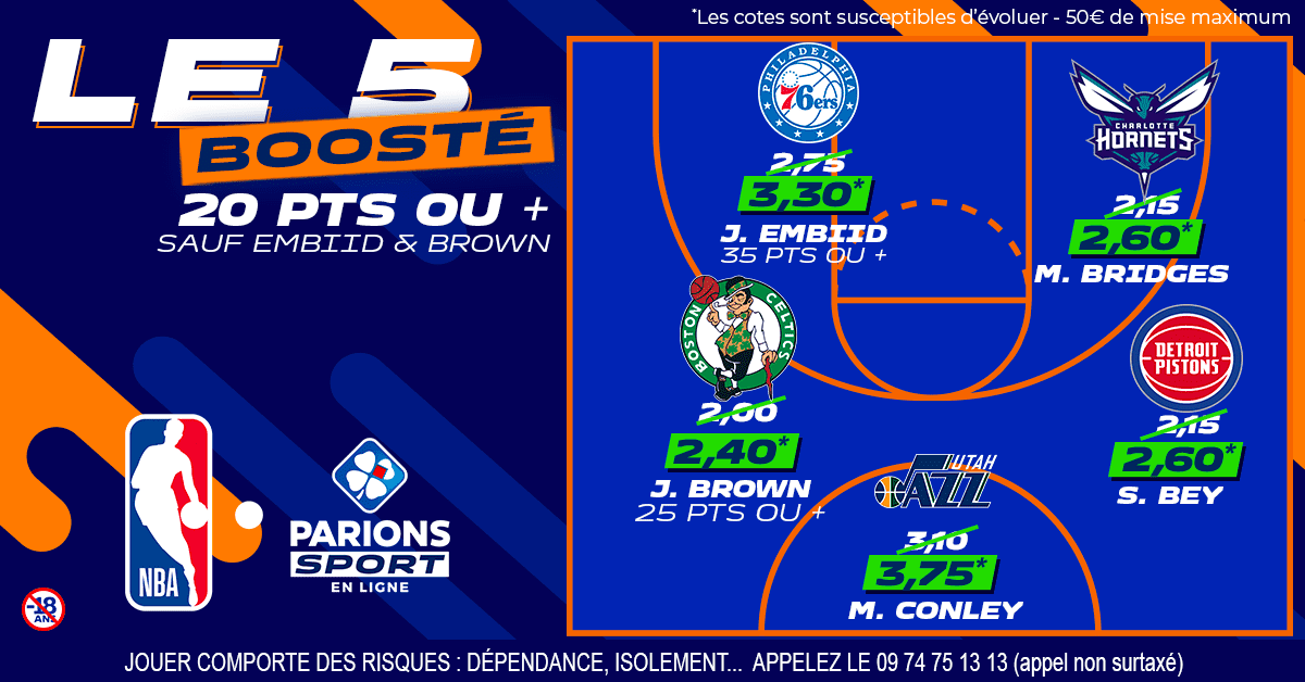 Amis parieurs, amies parieuses, l’heure est venue de se mouiller. En ce lundi 10 janvier, c’est un joli petit programme que nous offre la NBA avec sept matchs au menu. Cela offre de nombreuses opportunités pour se faire plaisir avec un petit pari, et aujourd’hui on a décidé de vous proposer cinq cotes boostées histoire de varier les plaisirs tout en augmentant encore plus vos gains en cas de pari gagnant.