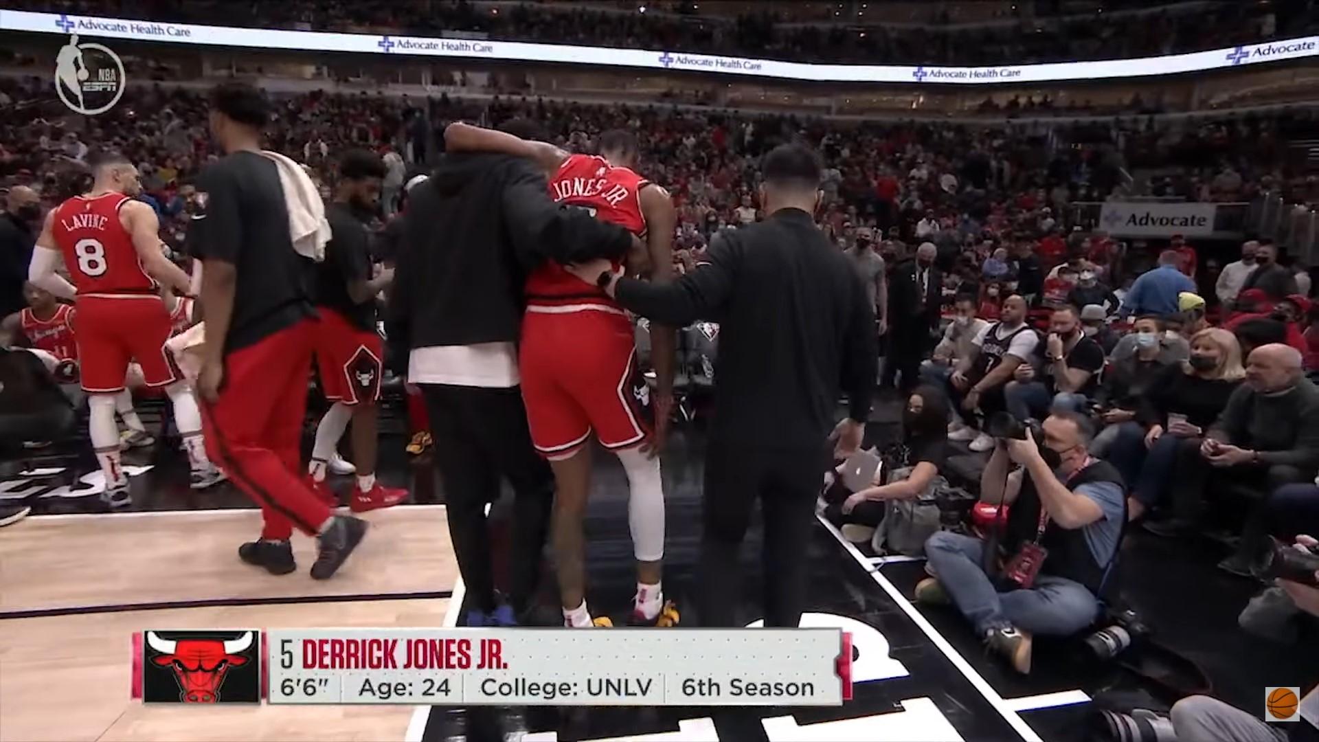 Blessé dès les premières secondes lors du choc entre les Bulls et les Nets mercredi, Derrick Jones Jr. avait immédiatement rejoint les vestiaires et l’inquiétude était forcément de mise concernant l’ailier de Chicago. Heureusement, le pire a été évité.