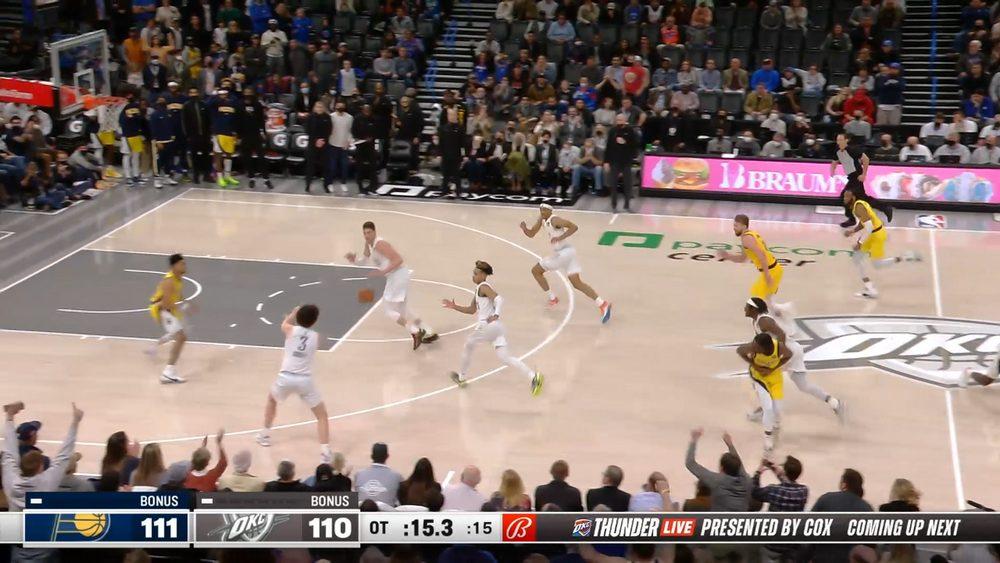 - Le Thunder et les Pacers sont allés en prolongation. : victoire pour Indiana avec 24 points, 18 rebonds et 10 assists de Domantas Sabonis.