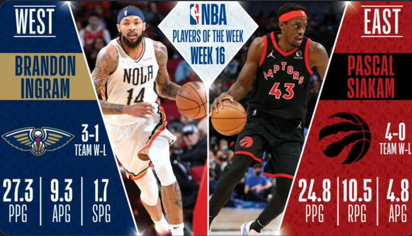 Officiel : Pascal Siakam et Brandon Ingram joueurs de la semaine en NBA. pic.twitter.com/lwAD9eZyCX