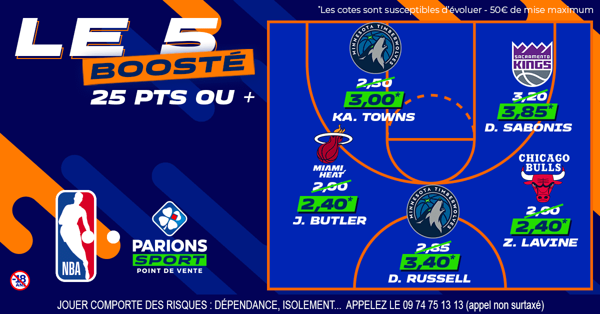 Jimmy Butler contre les Bulls (2,40 au lieu de 2,00) : pourquoi pas dans le camp d’en face avec Jimmy Butler. Il connaît un peu des hauts et des bas au scoring ces derniers temps, mais a tout de même atteint la barre des 25 dans quatre de ses huit derniers matchs. Et on sait qu’en face, la défense de Chicago n’est pas vraiment la même depuis que Lonzo Ball, Alex Caruso ou encore Pat Williams sont absents.