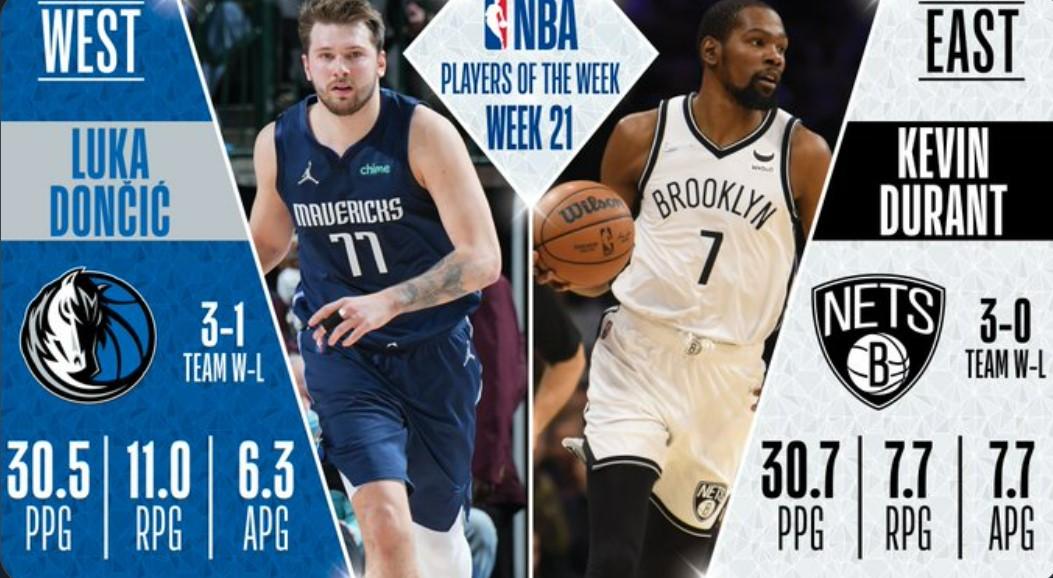 Dallas Mavericks guard Luka Dončić and Brooklyn Nets forward Kevin Durant have been named the NBA Western and Eastern Conference Players of the Week, respectively, for Week 21 of the 2021-22 season (March 7-13). pic.twitter.com/SAlPv7e96S