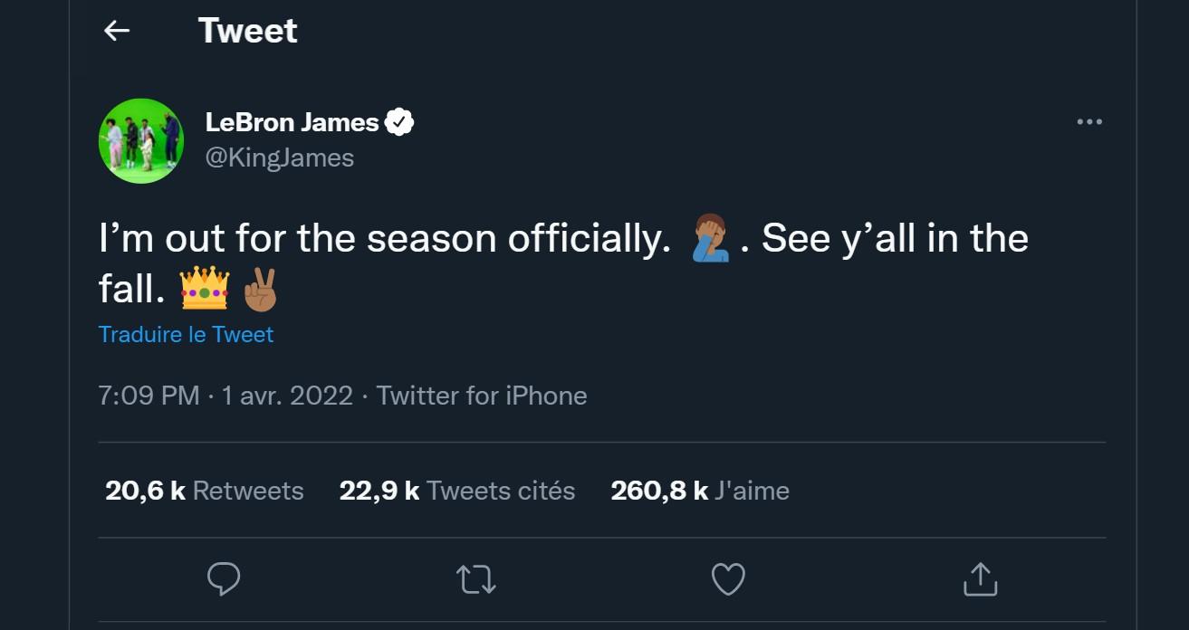Depuis quelques jours, on savait tous que LeBron James et ses Lakers n’allaient pas participer aux Playoffs cette saison. La seule question qui restait en suspens, c’était celle concernant la disponibilité du King lors des derniers matchs de la régulière, ce dernier étant toujours en course pour le titre de top scoreur. Mais on ne verra plus BronBron sur les parquets cette saison.
