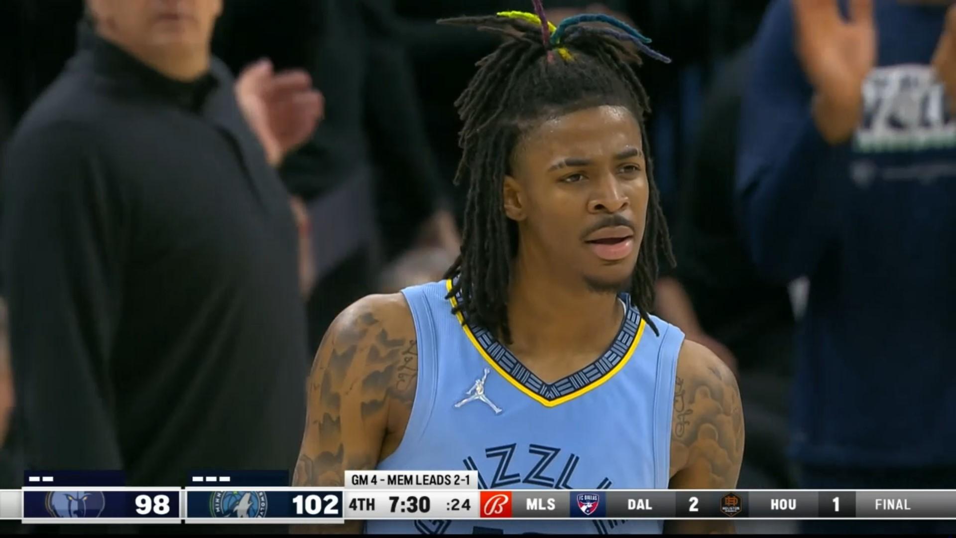 Malgré tout, inutile de dire qu’on attend beaucoup plus du garçon. On peut parler de la défense de Minnesota aussi longtemps qu’on veut, on peut discuter de l’arbitrage et d’ailleurs les Grizzlies ne s’en privent pas (Ja a notamment été en foul trouble au Game 4 ce qui ne l’a pas aidé à trouver son rythme, et puis les nombreuses fautes n’aident pas le jeu en transition…), et on peut mettre en avant le fait que Morant parvient à profiter de cette grosse attention pour plus peser dans le playmaking (15 assists pour 2 turnovers dans le Game 4). Sauf que lorsqu’on a atteint le niveau de hype de Ja et qu’on possède ses incroyables capacités, on n’a pas d’autre choix que de répondre présent peu importe les circonstances sous peine de se prendre une vague de critiques. Surtout quand on a l’habitude de l’ouvrir. Ce n’est un secret pour personne, Morant n’est pas du genre à avoir la langue dans sa poche. Il a déjà quelques grosses déclas à son actif et quand il s’agit de parler poubelle avec tous ses copains de Memphis, y’a du monde. Vous pouvez également checker son compte Twitter sur lequel il n’hésite pas à se montrer tranchant. Ça publie la célèbre vidéo de Michael Jordan avec une batte de baseball après la défaite du Game 1, ça trolle KAT après la victoire du Game 3, bref ça ne rate pas une occasion de se la ramener.