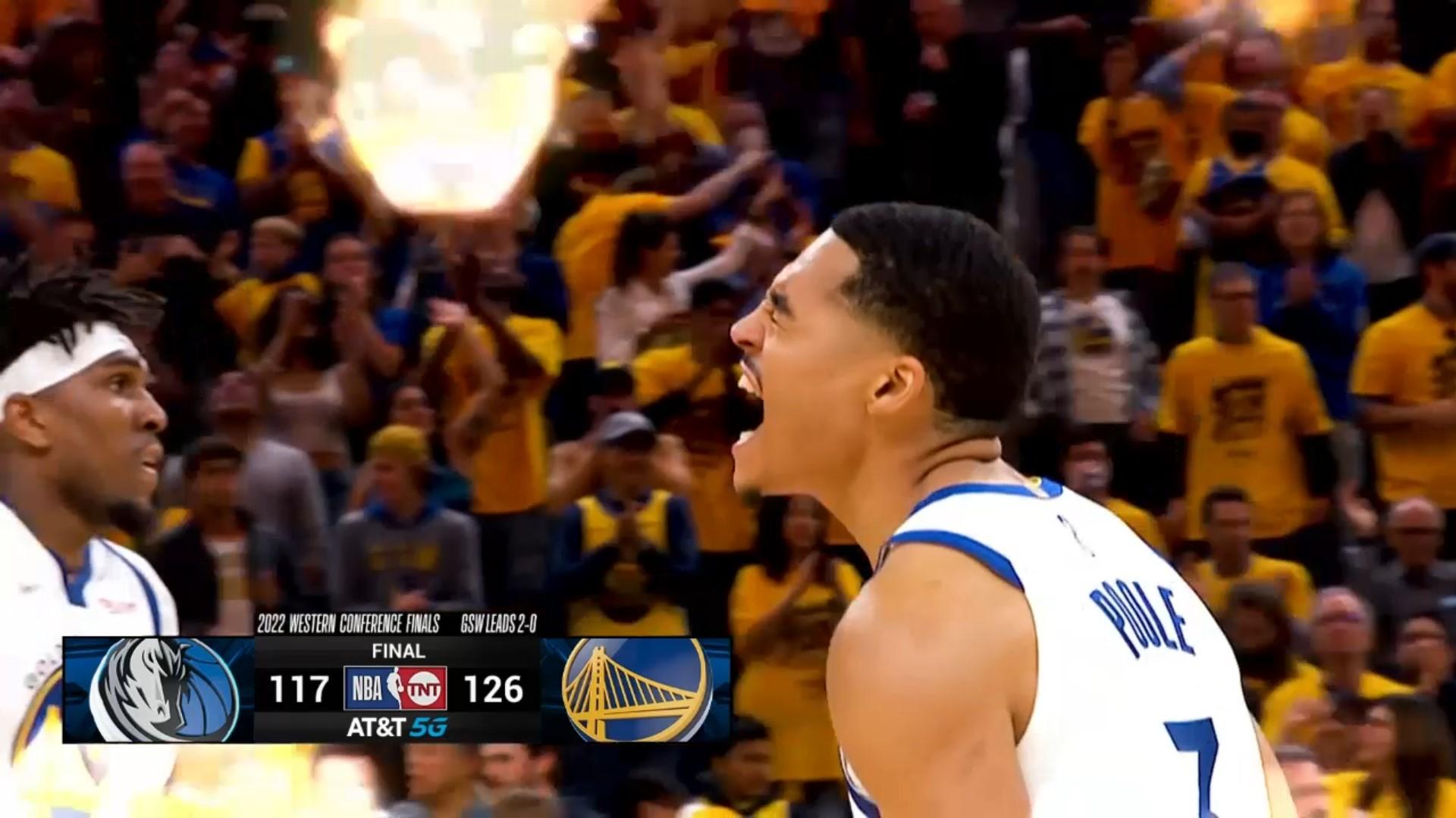 Le trio magique des Warriors dans ce retournement de situation ? Oubliez Stephen Curry – Klay Thompson – Draymond Green le temps d’un instant et rendons hommage à Kevon Looney, Otto Porter Jr. et Jordan Poole. On a déjà fait un focus sur le premier, MVP du match s’il vous plaît, mais les deux autres méritent également la lumière. Avec 11 points, 7 rebonds, 4 passes, 1 interception et 1 contre à 4/4 au tir (1/1 de loin, 2/3 aux lancers) en 24 minutes, OPJ a été hyper précieux dans le comeback des Dubs, tandis que Michael Jordan Poole a une nouvelle fois régalé en sortie de banc : 23 points, 5 passes, 2 interceptions, 7/10 au tir, 2/4 du parking, 7/7 aux lancers-francs, avec en bonus un regard de tueur lancé vers Davis Bertans, autant dire que c’était Poole Party au Chase Center ! Le lineup Looney – Poole – Porter Jr. – Thompson/Wiggins – Moses Moody (oui oui le rookie a joué !) est celui qui a permis aux Warriors de véritablement prendre les commandes de la rencontre, les trois premiers marquant d’ailleurs l’ensemble des 19 points de Golden State au cours des six premières minutes du quatrième quart (19-9 pour GS sur la période) ! Steph Curry est ensuite revenu sur le terrain pour mettre le couvercle avec l’aide de Klay et Draymond, mais la différence a été faite bien avant. Au total, si on dézoome sur l’ensemble de la deuxième mi-temps, les Warriors ont planté un terrible 68-45 aux Mavericks, grâce notamment à une défense de zone qui a su perturber le rythme des Mavs et une réussite au tir plus qu’insolente dans l’ultime période (15/19 au shoot, meilleure marque de la saison !). #StrengthInNumbers on vous dit.