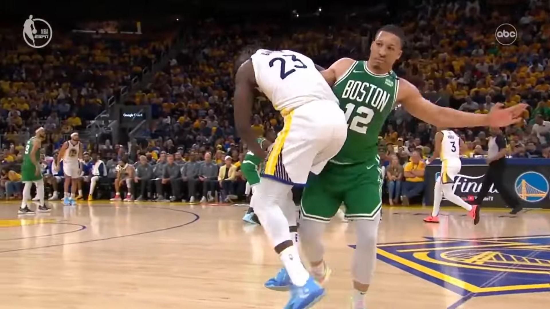 Sur cette action, Jaylen Brown tente un shoot à 3-points, contesté par Draymond. Le défenseur fait faute et les deux joueurs tombent au sol, emportés par leur élan. Le joueur des Celtics s’est retrouvé légèrement touché à la tête par les jambes de l’adversaire. Le début d’une nouvelle altercation mais pas de technique sifflée. Sûrement la goutte d’eau pour les Verts. Ils rentreront finalement aux vestiaires en tête au score avant de se faire dévorer en deuxième mi-temps.