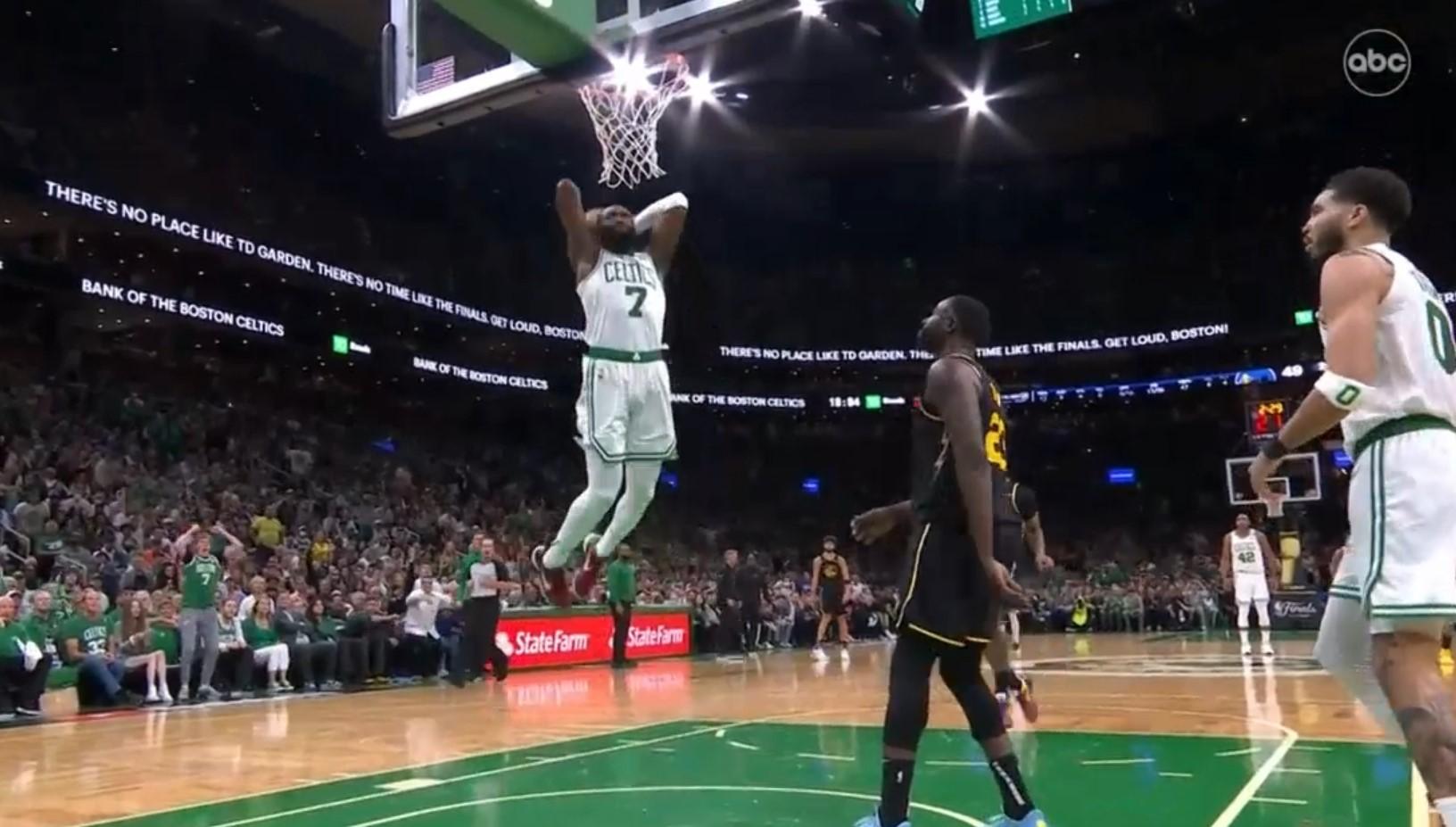 Jouant leur tout premier match de Finales NBA sur le parquet du TD Garden cette nuit, Jaylen Brown et Jayson Tatum ne voulaient pas passer à côté de l’événement. Pas après tous les efforts déjà réalisés jusqu’ici pour mener les Celtics à seulement trois victoires d’un titre de champion. Alors très vite, JB a montré aux Warriors qu’il était prêt à en découdre, avant que JT ne prenne les choses en main.