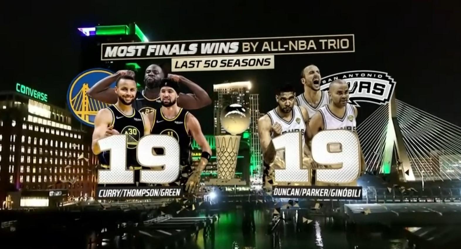 En Finales NBA pour la sixième fois en huit ans, le Big Three des Warriors composé de Stephen Curry, Klay Thompson et Draymond Green vient de décrocher sa 19e victoire sur la plus grande des scènes. 19, c’est autant qu’un certain trio qui a fait le bonheur de San Antonio pendant de longues années.